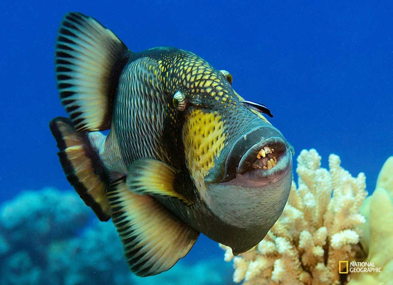 Enric Sala/National GeographicThe Titan triggerfish, a voracious predator, being cleaned by a cleaner wrasse.