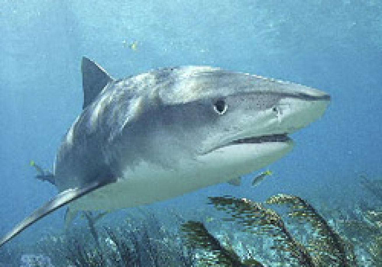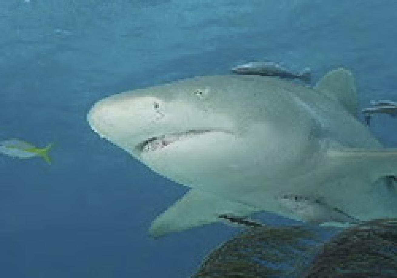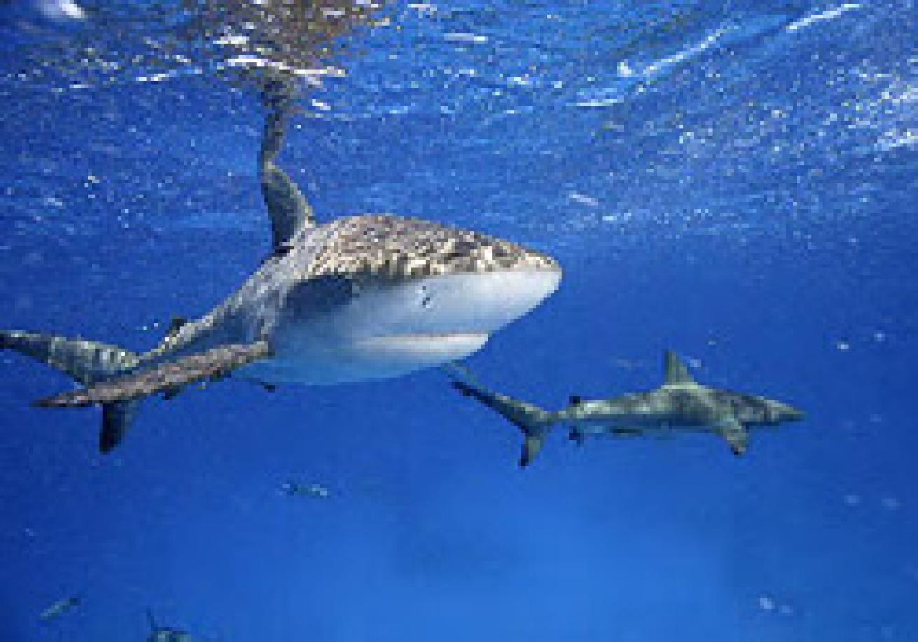 They are the most common sharks and cruise the offshore reefs. The Caribbean reef shark is the primary shark on the shark feeding dive. They range in length from 5' to 8' to 10'. The tips of their fins and the lower lobe of their tail are dusky. The blacktip shark also has dusky tips, but its anal fins are pale to white. The first dorsal fin is relatively small and begins behind the pectoral fins. Little is known about the Caribbean reef shark's biology. Females bear 4 to 6 pups per litter. It primarily feeds upon fish.