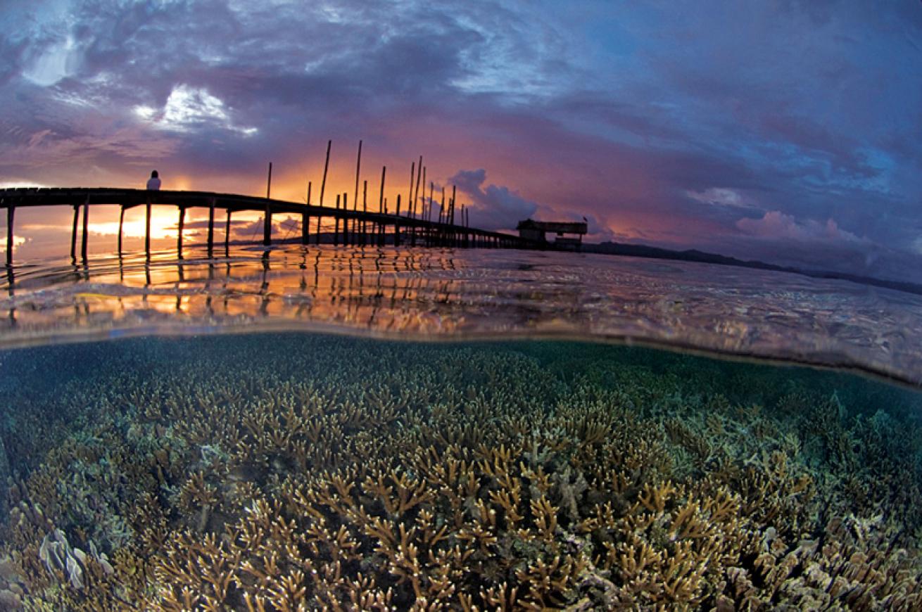 Find compelling subjects above and below. Photos that have a beautiful topside landscape and a dreary underwater scene or a beautiful underwater subject but only sky above are less compelling. Finding the right subjects usually takes scouting. For reef splits, it helps to work at low tide when the coral is only inches from the surface of the water. I typically explore an area with only my mask and camera, leaving my fins behind to avoid damaging the reef.