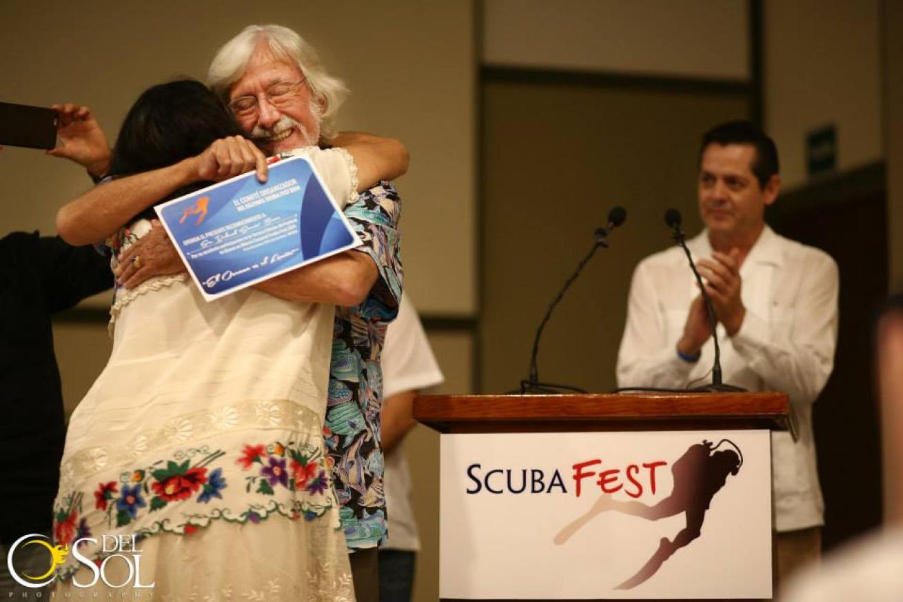 Courtesy of cozumelfest.comJean-Michel Cousteau hugs an honoree at Cozumel Scuba Fest.
