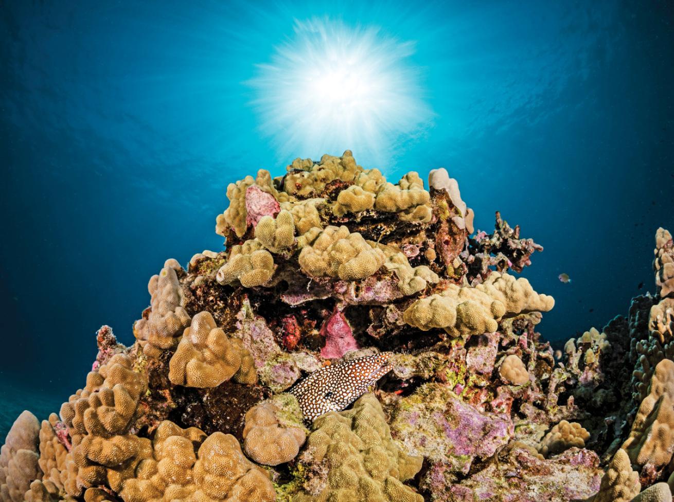 A whitemouth moray sits in its hard Porites coral kingdom off the coast of Kona, Hawaii.