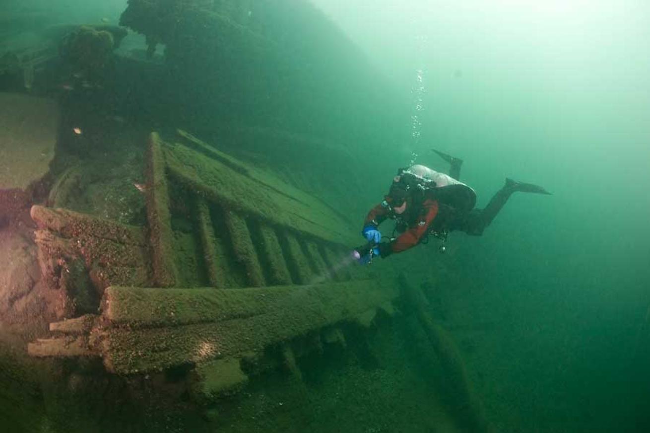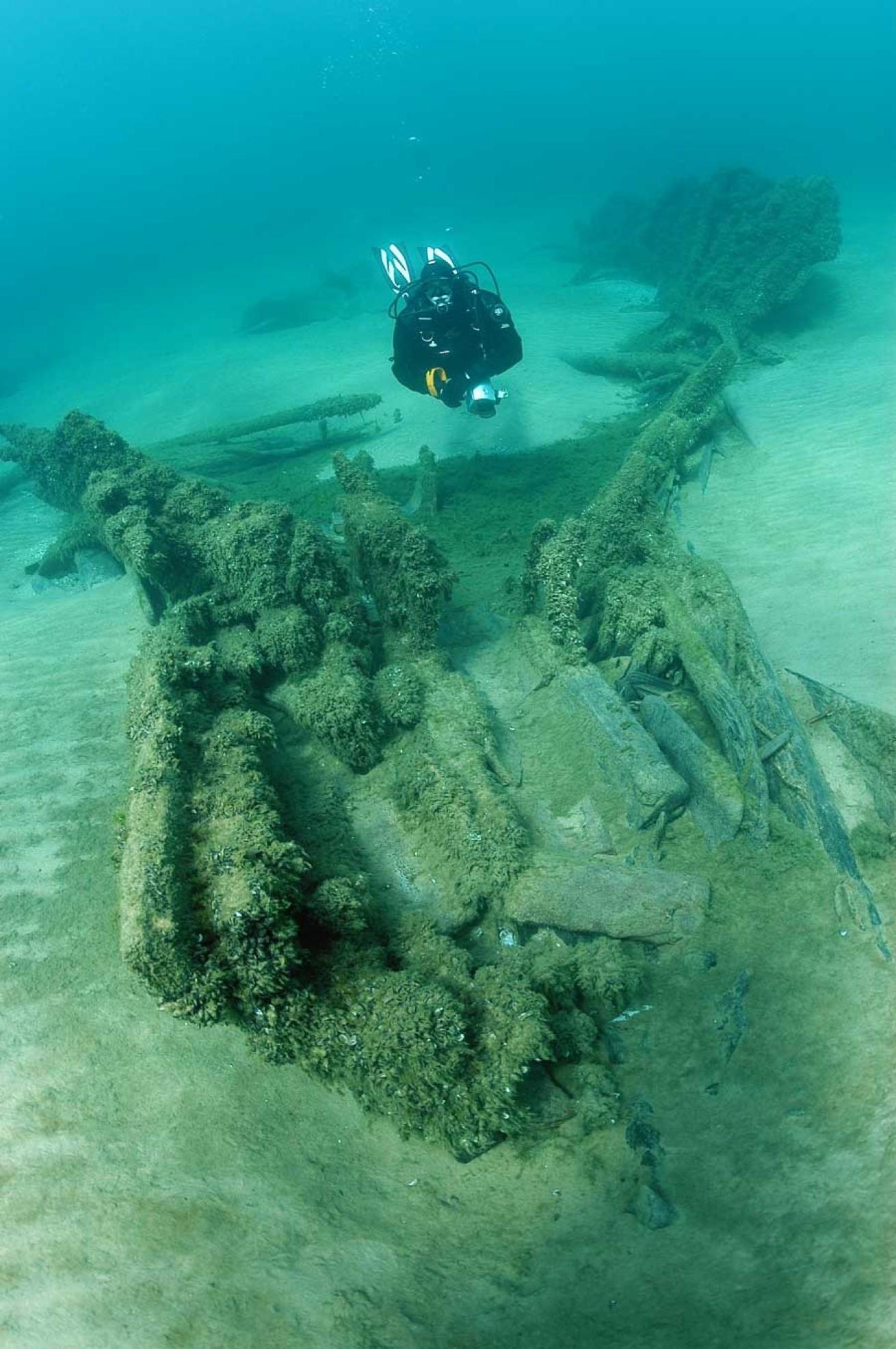 Tamara Thomsen / Wisconsin HIstorical SocietyThe two-lane roads of Wisconsin’s Door County wind past honor-style cherry stands, rocky coastline, grassy dunes overlooking Lake Michigan, red barns and white clapboard churches. Above the water, these communities are perfect pictures of small-town charm. Beneath the waves, the wrecks tell another story. The French gave this pinky-shaped peninsula the name Porte des Morts Passage, or Way to the Door of Death, after it proved a navigational hazard. Each inlet, from Sturgeon Bay on the lake-side to Ellison Bay on the Green Bay coast, is littered with shipwrecks — so many that new finds are still being discovered. Jet skiers happened upon the Australasia in 17 feet of water in 2005 and thanks to discovery at a time when preservation trumps looting, many of the ships artifacts still lie within and around. The smaller tokens have been removed from most downed ships, but many deeper wrecks remain popular because they serve as intact links to an era of Great Lakes maritime history. One such site, Ocean Wave, sports a well-preserved eagle figurehead; the schooner was found in 2003 by commercial fishermen whose nets caught on the vessel in 110 feet of water. The most popular site lies at 60 feet in Bailey’s Harbor, accessible to all certified divers. Frank O’Connor, a 300-foot steamer, is prized for its intact boilers still standing on deck and its 12-foot prop. On clear days, its entirety is visible from the surface. divedoorcounty.com
