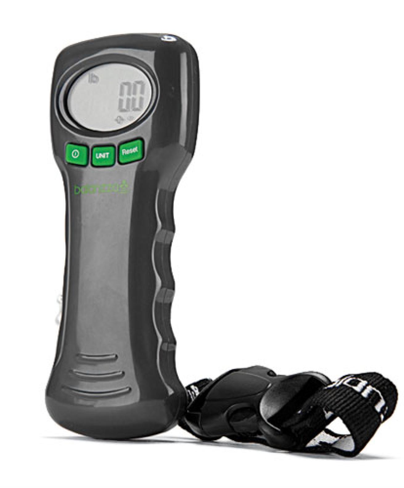 Avoid getting surprised on the road with excess weight charges. This model is horizontally positioned so it acts as a handle for lifting, and it reads up to 100 pounds and runs on a pair of AAAs.