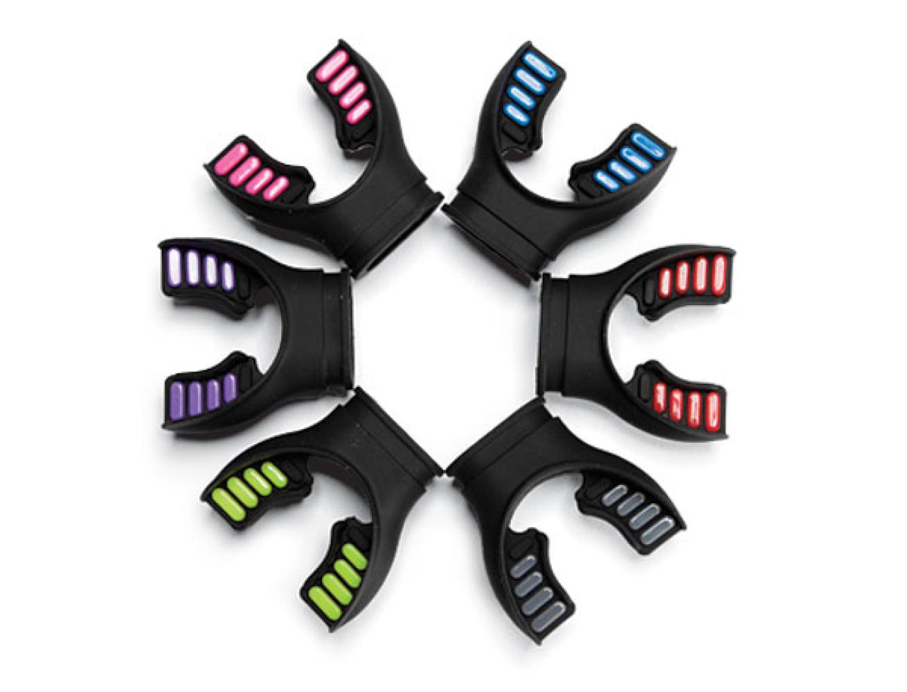 This dual-compound mouth- piece is made from two types of silicone, soft where it needs to be, and stiff in the bite tabs for a solid grab.
