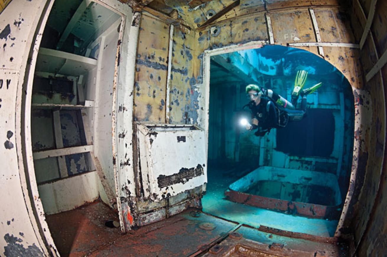 Pacific Gas, Papua New Guinea The stern’s multilevel superstructure boasts exterior stairways, walkways and swim-throughs in the crew quarters, but it’s the bow where the real action happens. Under the cover of darkness, divers can drop to the base of the mooring line, where an open hatch in the ship’s forward hold acts as a window onto a thousands-strong school of flashlightfish, which leave the hatch looking like a massive trail of glowing ants as they traverse the cargo holds.