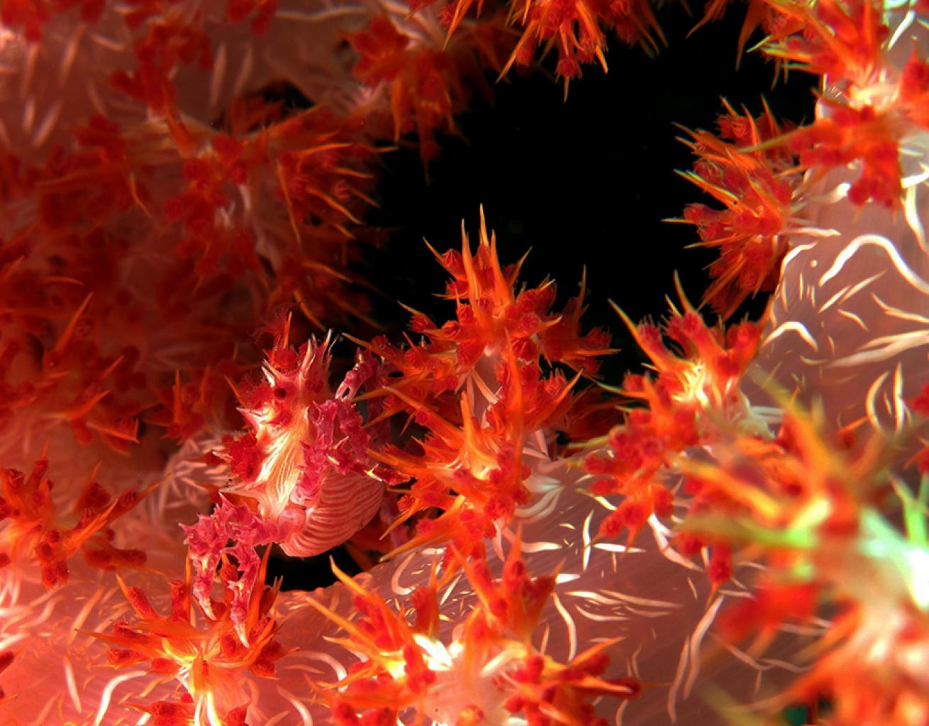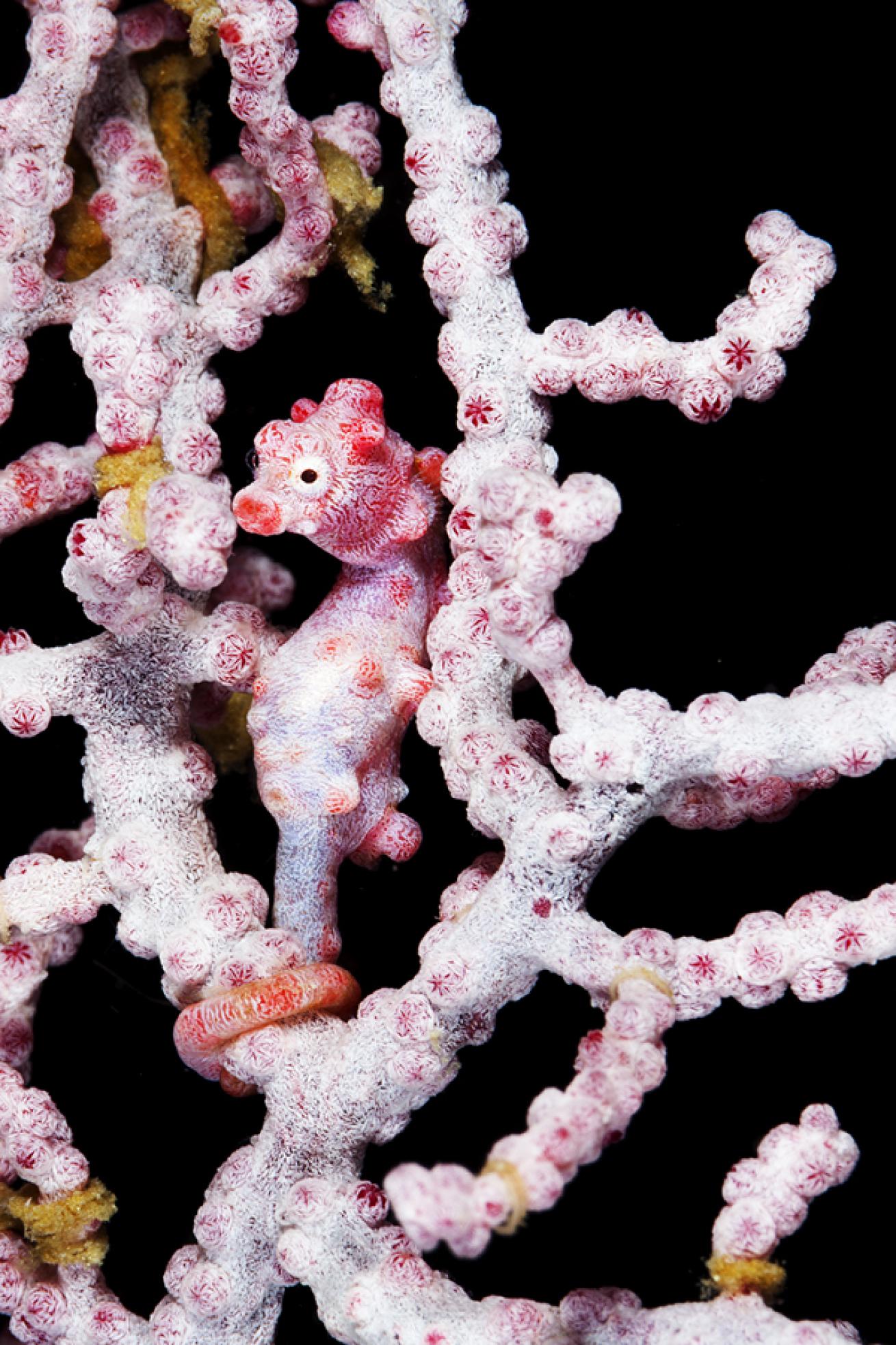 A pygmy seahorse hides in plain sight. Their prehensile tails allow them to wrap around and cling closely to their anchored surroundings