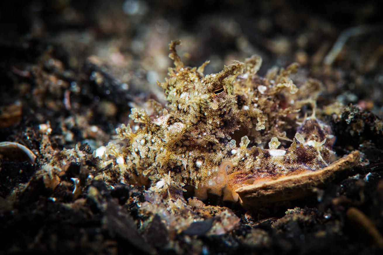 A hairy octopus lays watchful in full camouflage. These creatures are extremely rare to find due to their incredible ability to change and blend in with the colors and textures of the surrounding sea floor.