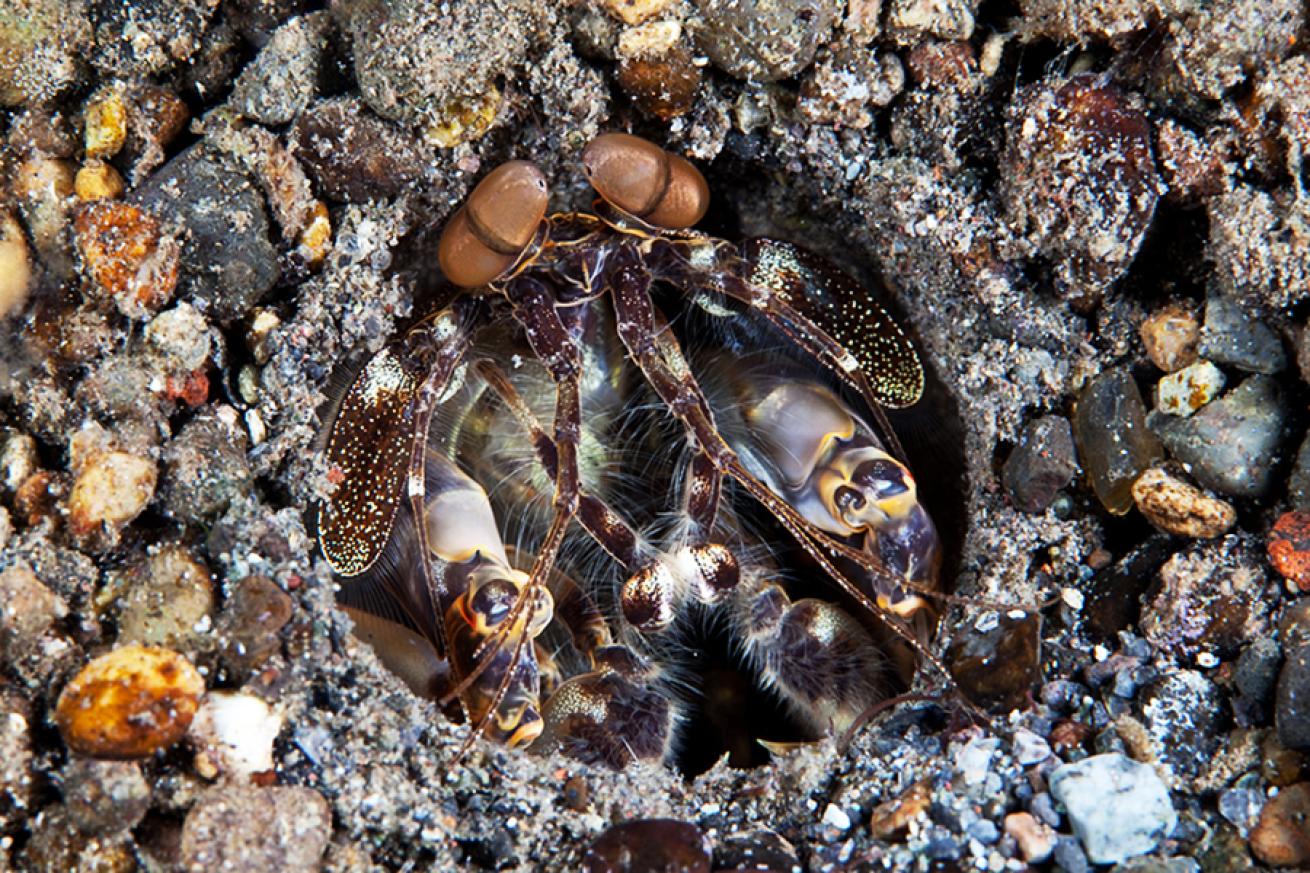 Here is a picture of a translucent purple-spotted mantis shrimp perched perfectly upon an anemone, almost invisible to the naked eye.