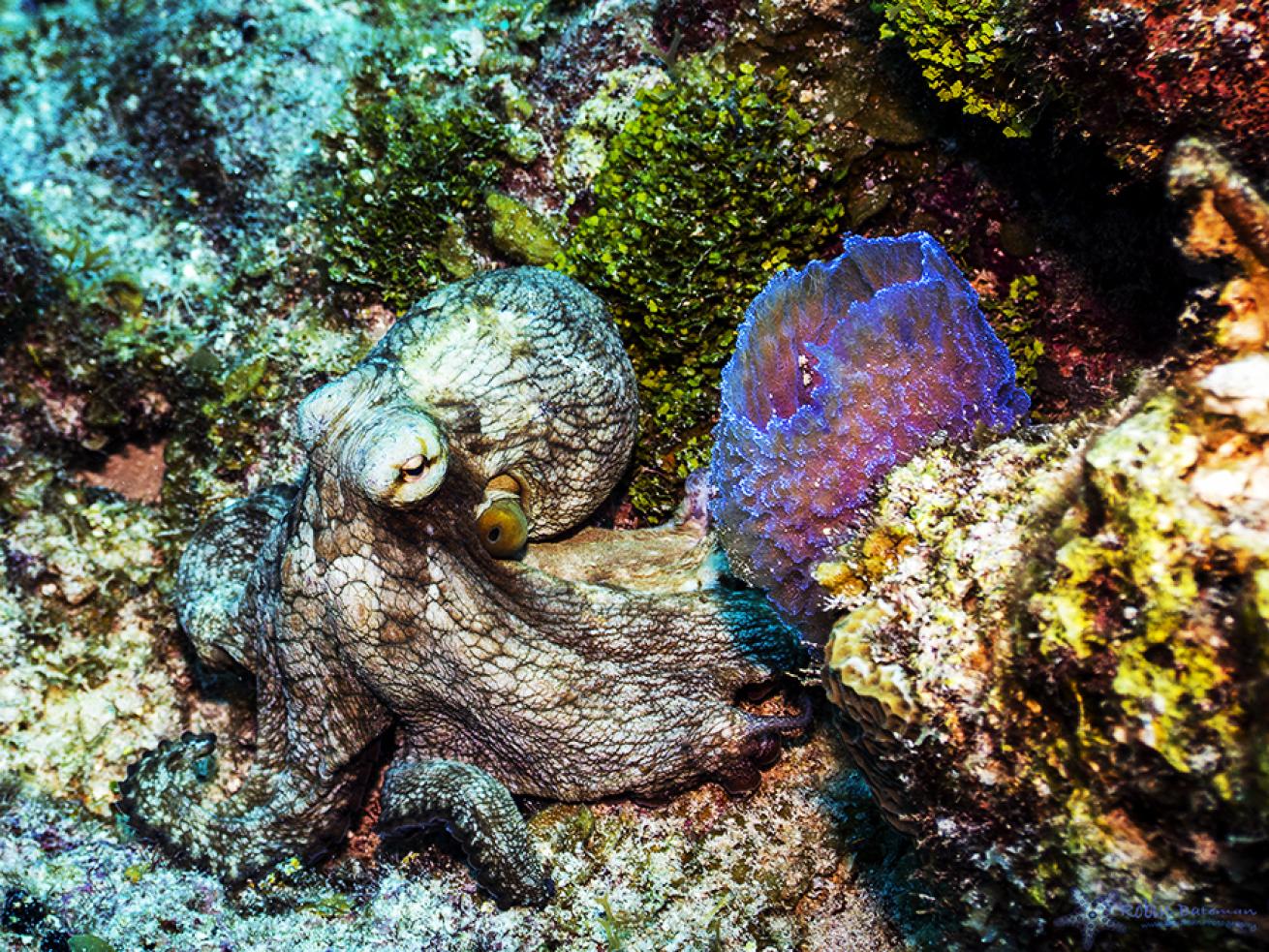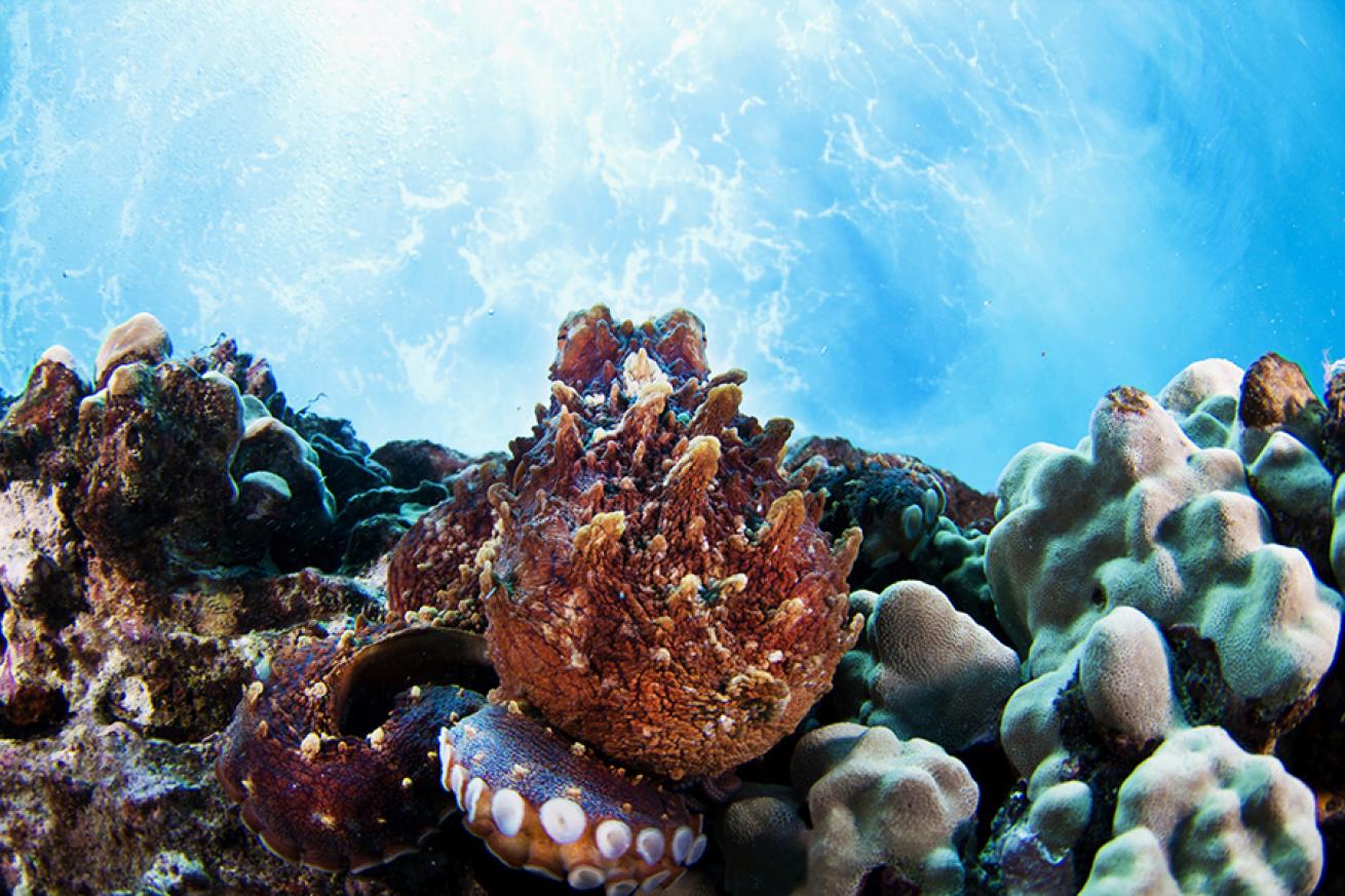 A curious octopus blends in with its surroundings. Octopuses are considered to be the most intelligent of the world’s invertebrates, known even for using tools like sunken coconut shells and putting them together into makeshift camouflaged shelters. Ingenious!
