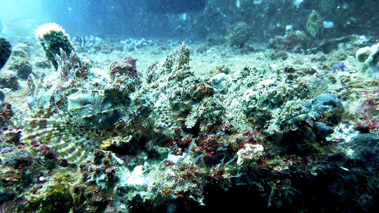 The body of the scorpionfish is often covered in feathery fins that allow it to camouflage itself into the rocky, irregular textures of the surrounding coral.