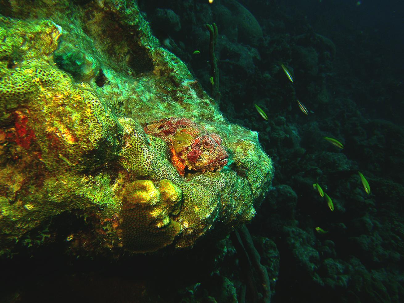 On the HMAS Brisbane on Queenslands Sunshine Coast, three scorpion fish lie waiting in camouflage. As you can see, they are almost undetectable. The colors and markings of the scorpionfish allow it to blend in with its environment to the point of being virtually invisible. A true master of disguise trio.