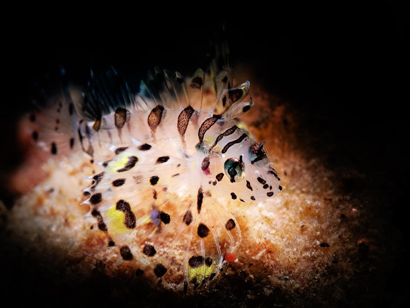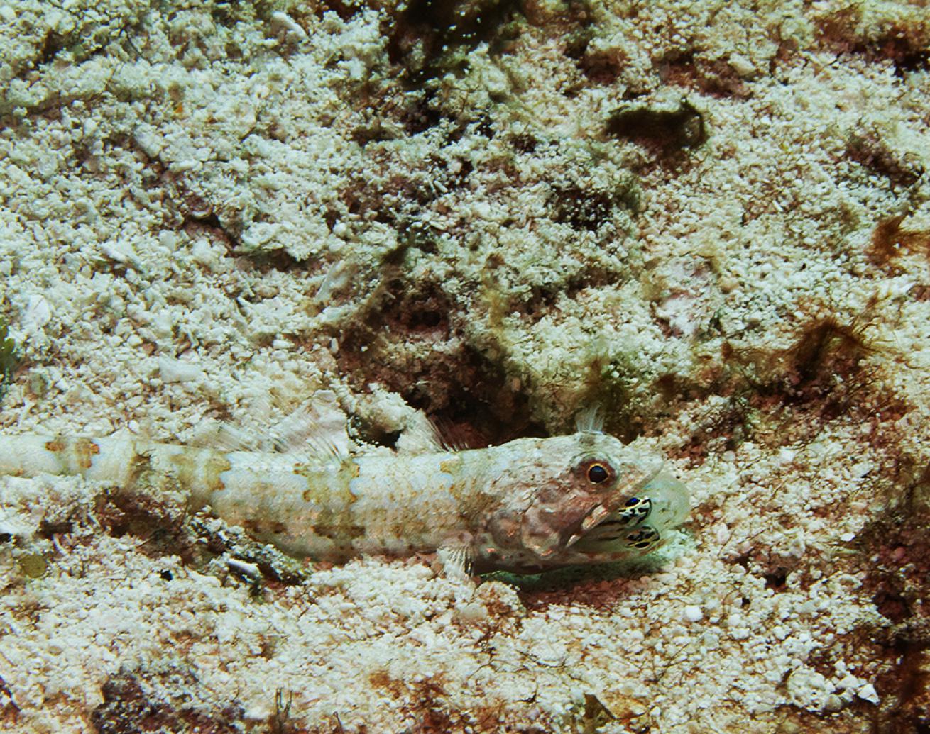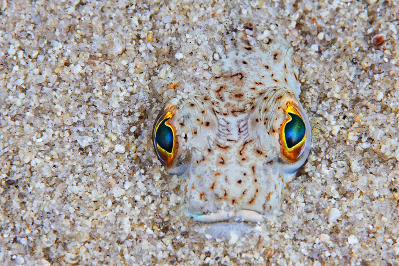 This image of another Trachenidae was taken during a night dive. While they primarily hide under the sand in order to jump out and bite their victims, they also have poisonous spines running along their dorsal fins and gills which release a painful toxin that defends them against predators.