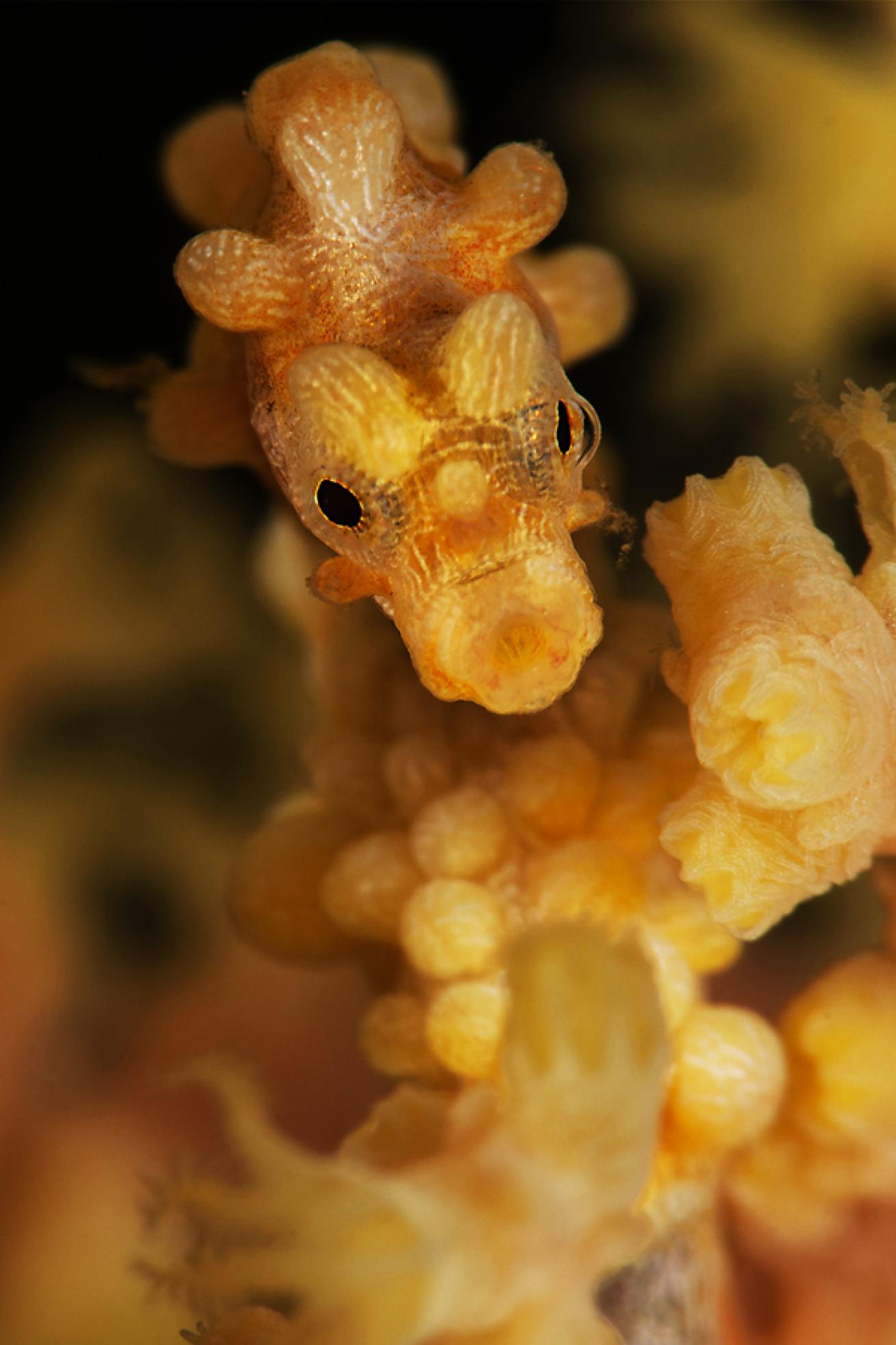 Here is a yellow pygmy seahorse on its yellow gorgonian. Large, bulbous tubercles cover this species’ body and match the colour and shape of the polyps of its host species of gorgonian coral. There are many different color variations of pygmy’s.