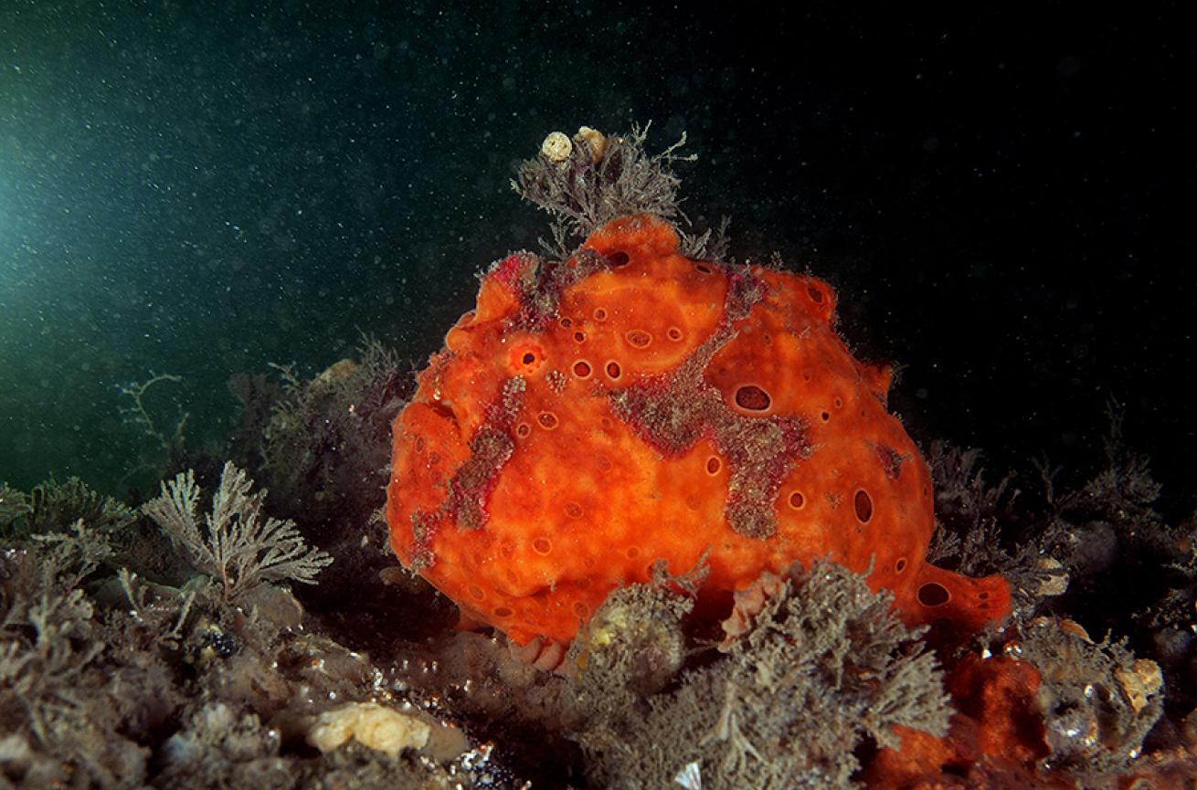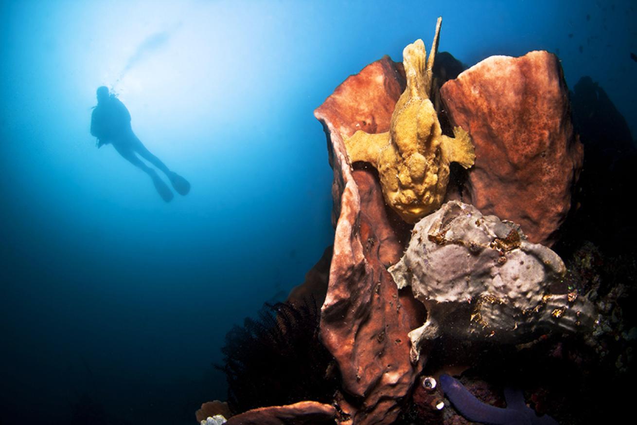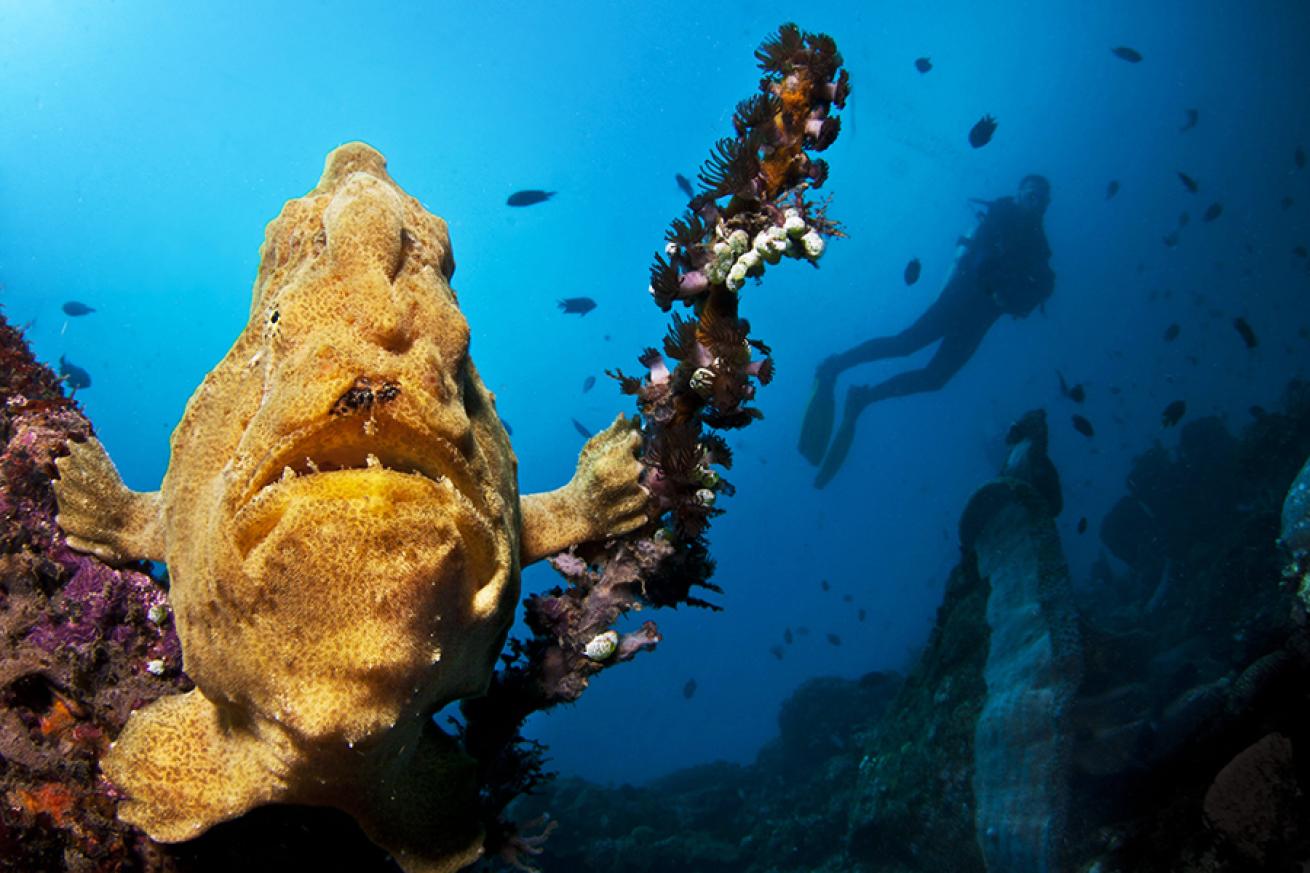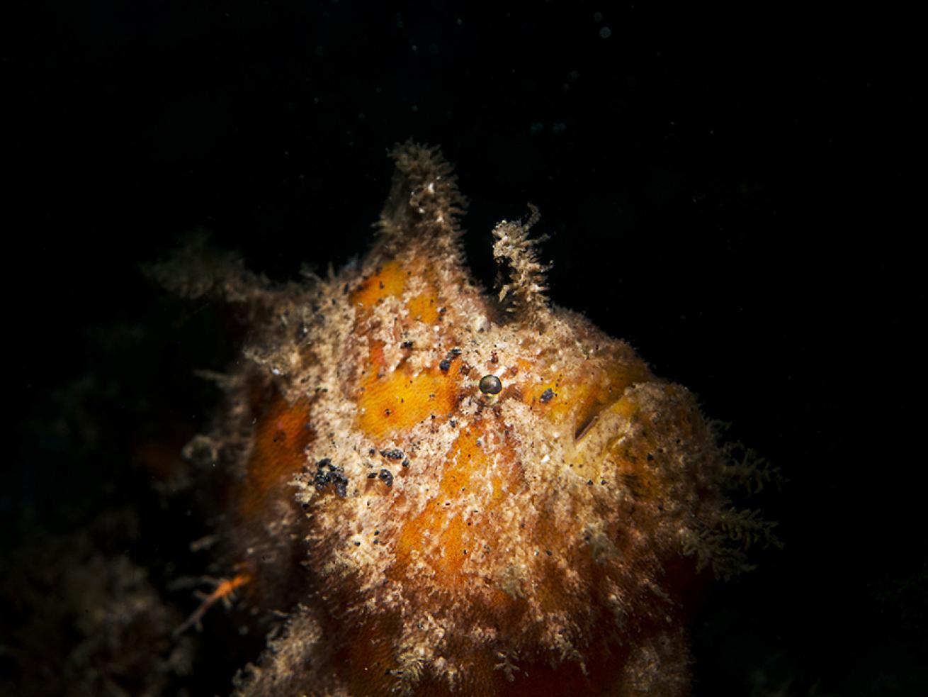 A leafy frogfish poses dramatically against the dark waters. Sometimes when they feel threatened, they inflate like a puffer fish in self-defense. Frogfish wave built-in lures and wait patiently for unsuspecting meals to come along and nibble.