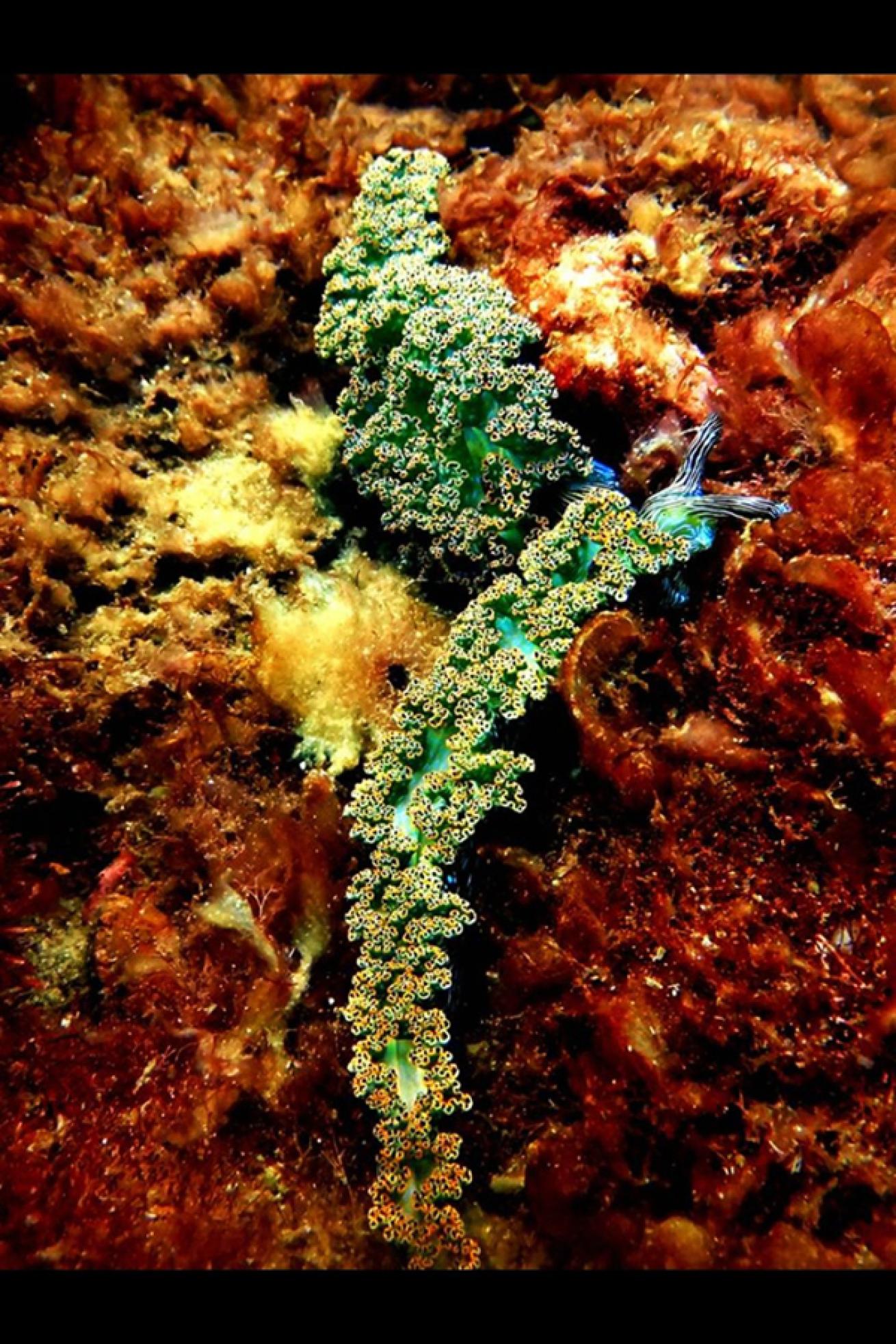 Here are a couple of nudibranchs camouflaged by their exotic designs and bright colors to blend in with their colorful reef environment. Nudibranchs derive their coloring from the food they ingest, helping in adapting and enhancing their camouflage.