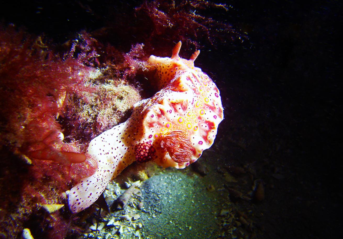 A nocturnal nudibranch blends in with its surroundings. Some species of carnivorous nudibranchs retain the foul-tasting poisons of some of their prey, like anemones, in order to secrete them later as a defense against predators.