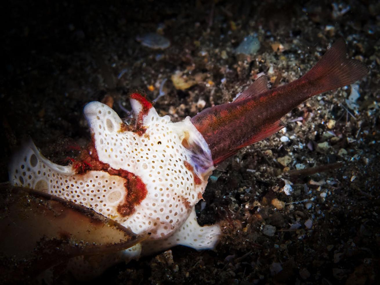 Many bizarre creatures inhabit the volcanic sand floor of Lembeh, Indonesia. Hairy frogfish are just a small fraction of the abundance of strange aquatic life lurking there.