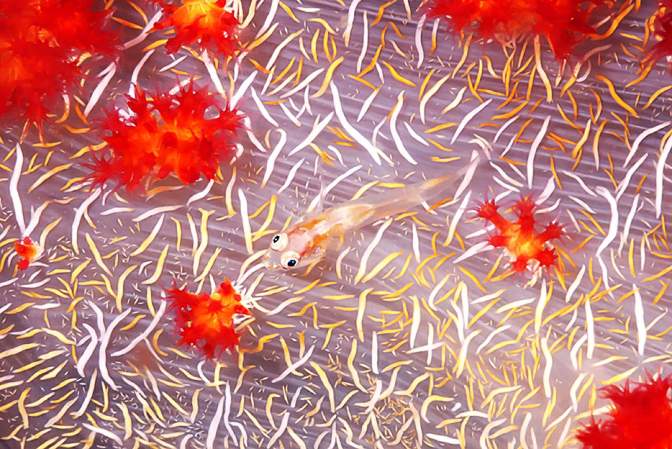 A translucent goby swimming across his soft coral home with perfectly matching colors. This blending adaptability aids this little fella in camouflaging and surviving within its environment against all odds.