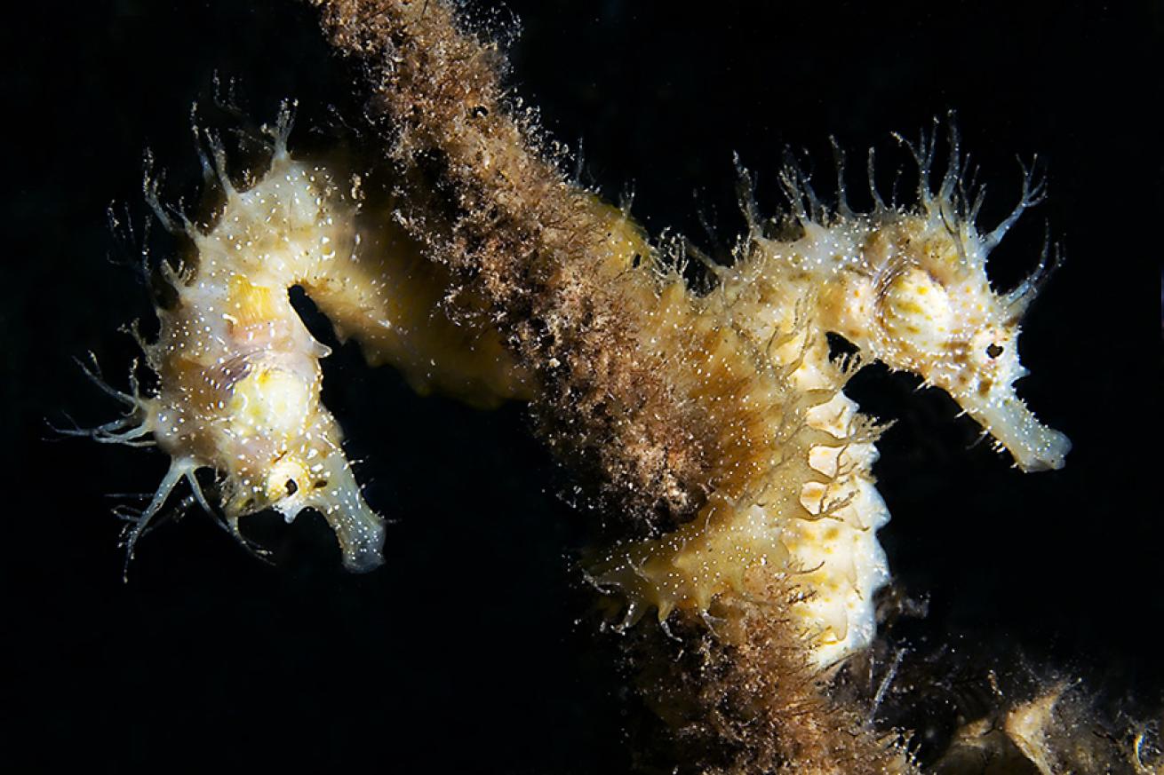 This is a couple of Hippocampus moluccensis or moluccan seahorses. Often found in pairs on the sandy and muddy bottoms of shallow protected bays, they sometimes wrap their tails around each other to better blend in with the sea floor.