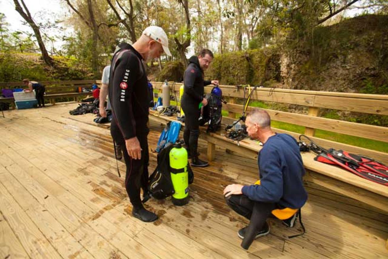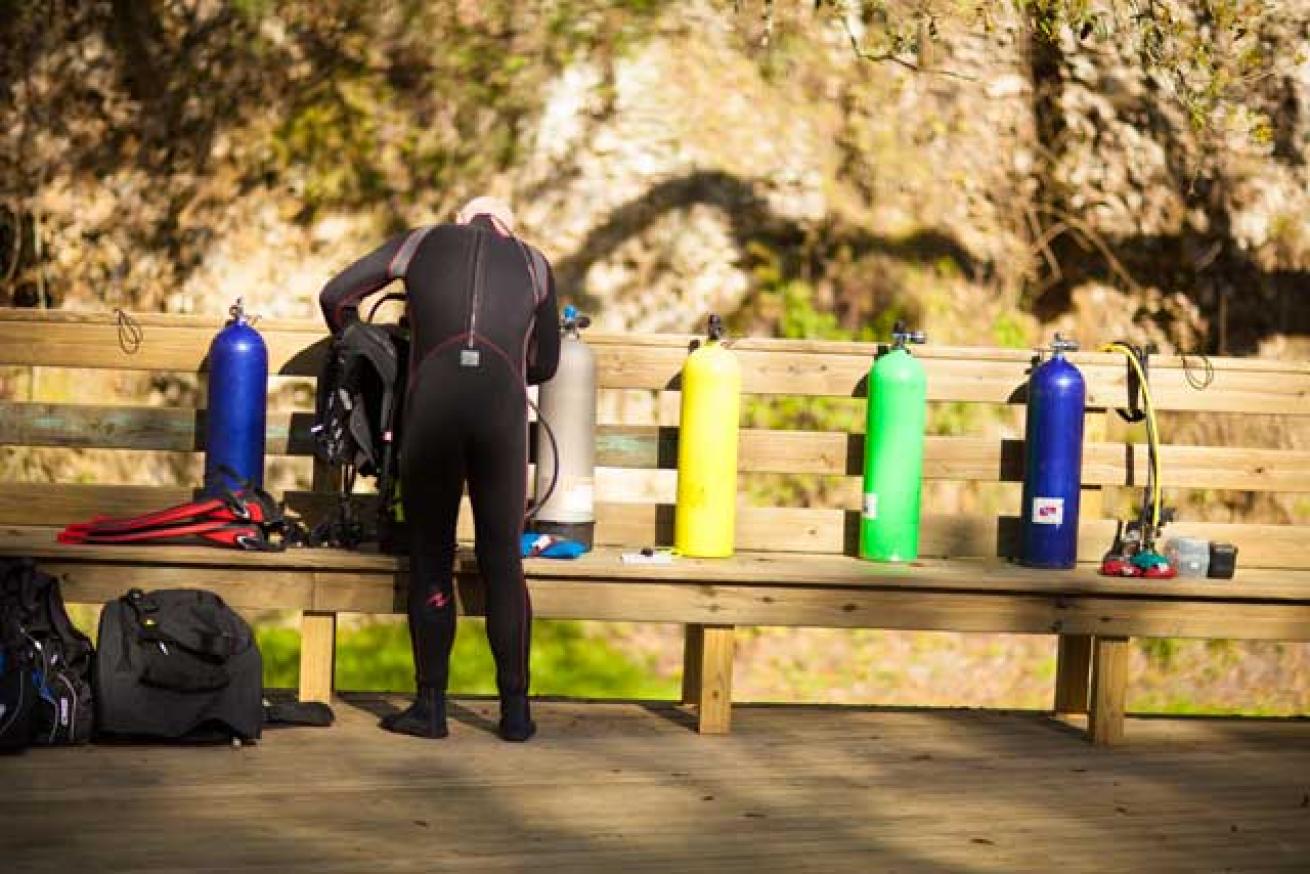 Jon WhittleTanks and BCs are lined up for test-team divers at Blue Grotto.