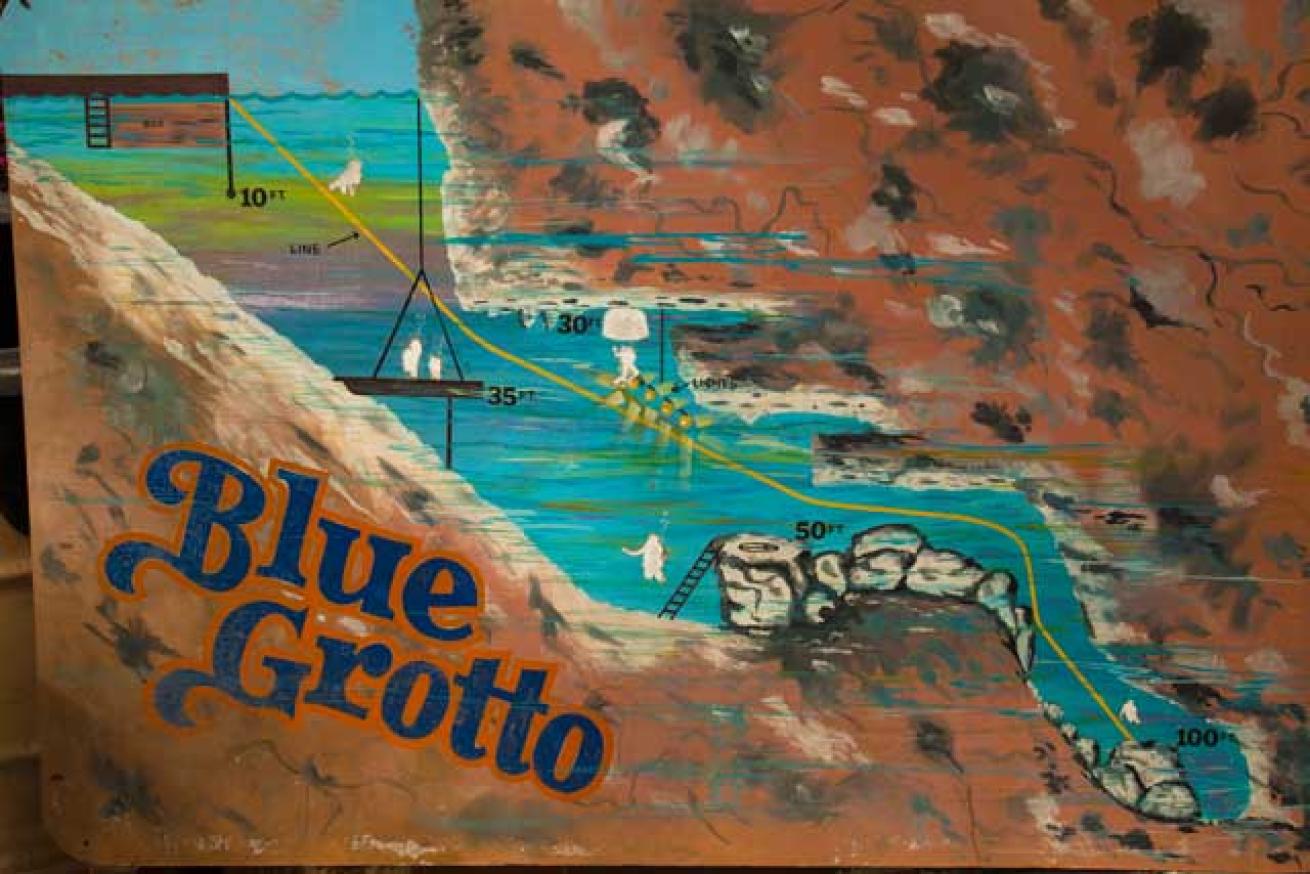 Jon WhittleA hand-painted sign outside Blue Grotto's office shows a cutaway of the cavern.