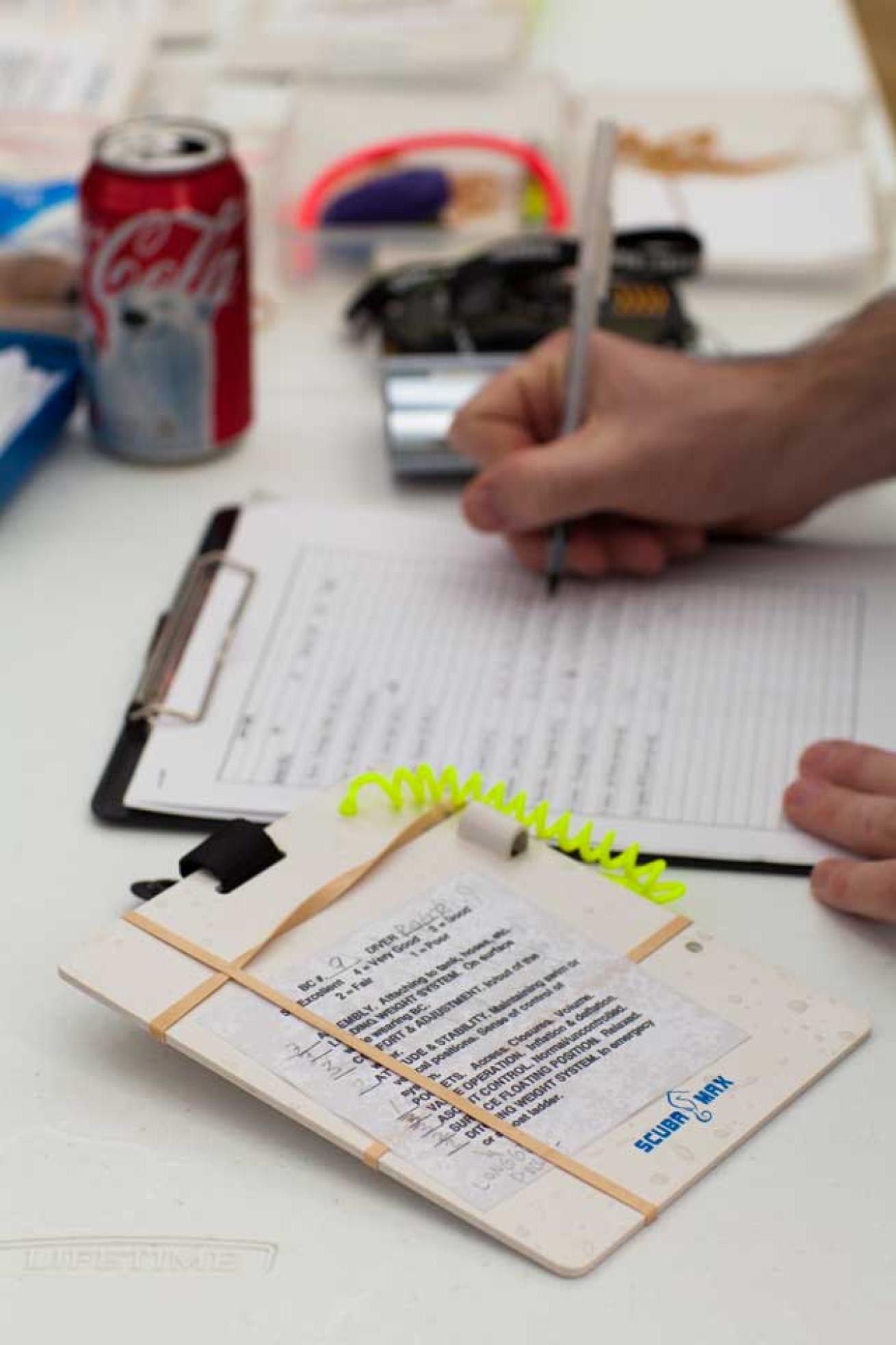 Jon WhittleScubaLab test-team divers record notes and scores on waterproof paper attached to slates.