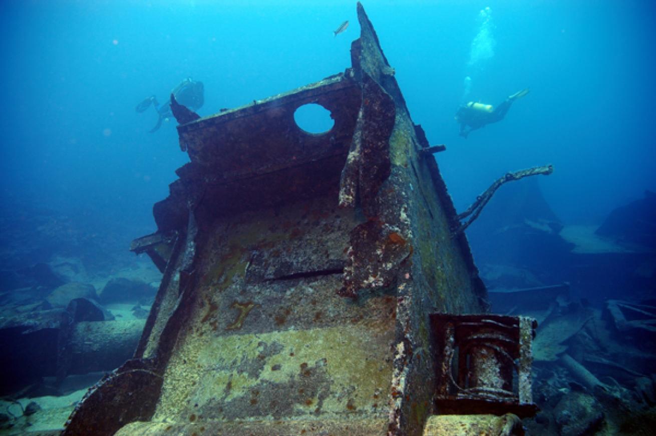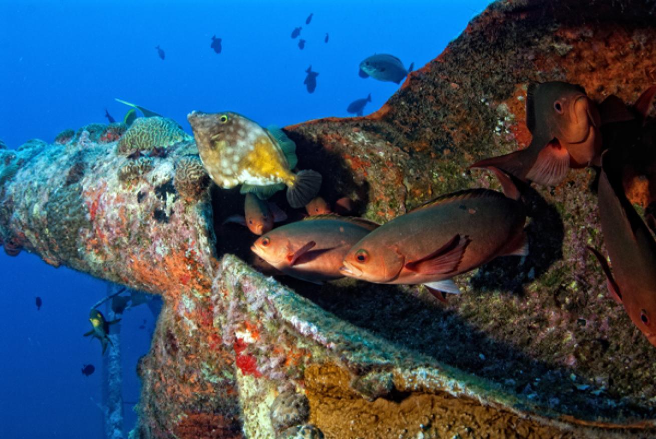 The ultimate tec dive in Bermuda is a visit to Argus Tower, some 35 miles southwest of the island. The peak of this volcanic seamount is reached at 192 feet; on it lie the remains of a submarine communications tower. With swarms of fish, including some large pelagics, this spot also attracts fishing boats seeking a prized catch.