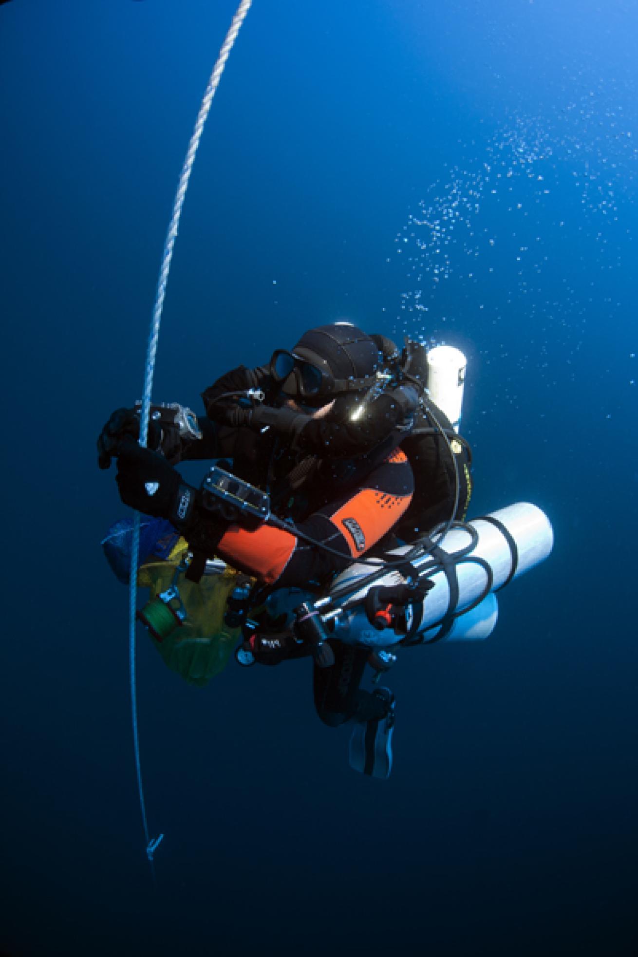 Iliffe’s face is barely visible under the increasing load of equipment, now well over 250 pounds. He looks like a Transformer. I run through my own mental checklist. Rebreather: Checklist done. Four bailout tanks: Check. Camera on the transom: Check. Video lights, camera strobes, sample bag, measuring tape, reel, lift bags: All checked. Checked. And double-checked.