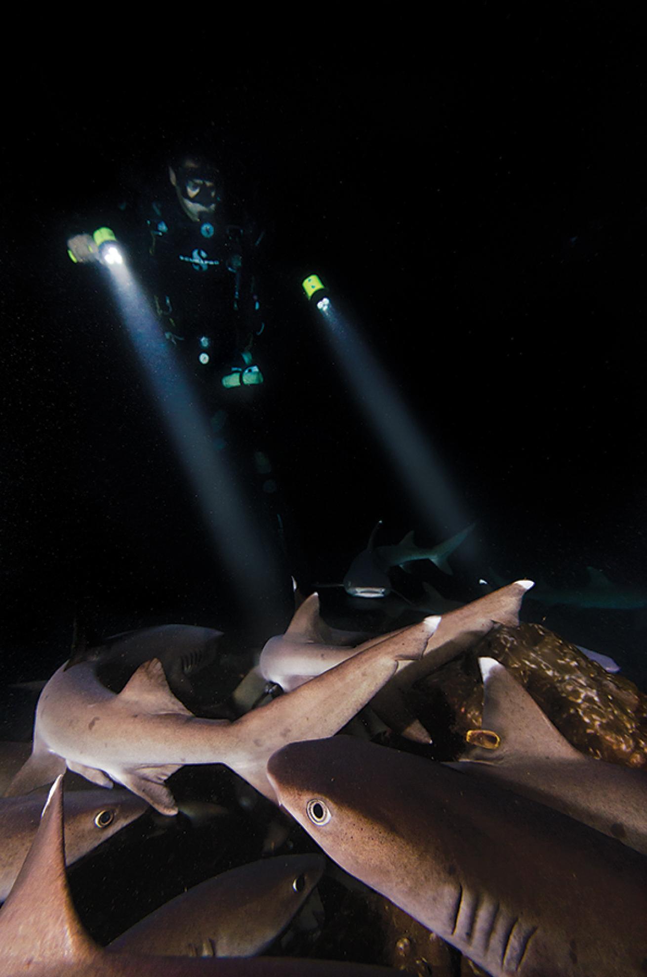 "The low camera angle captures the frantic hunting behavior of Cocos’ whitetip reef sharks in Manualita Garden — from a shark’s perspective."