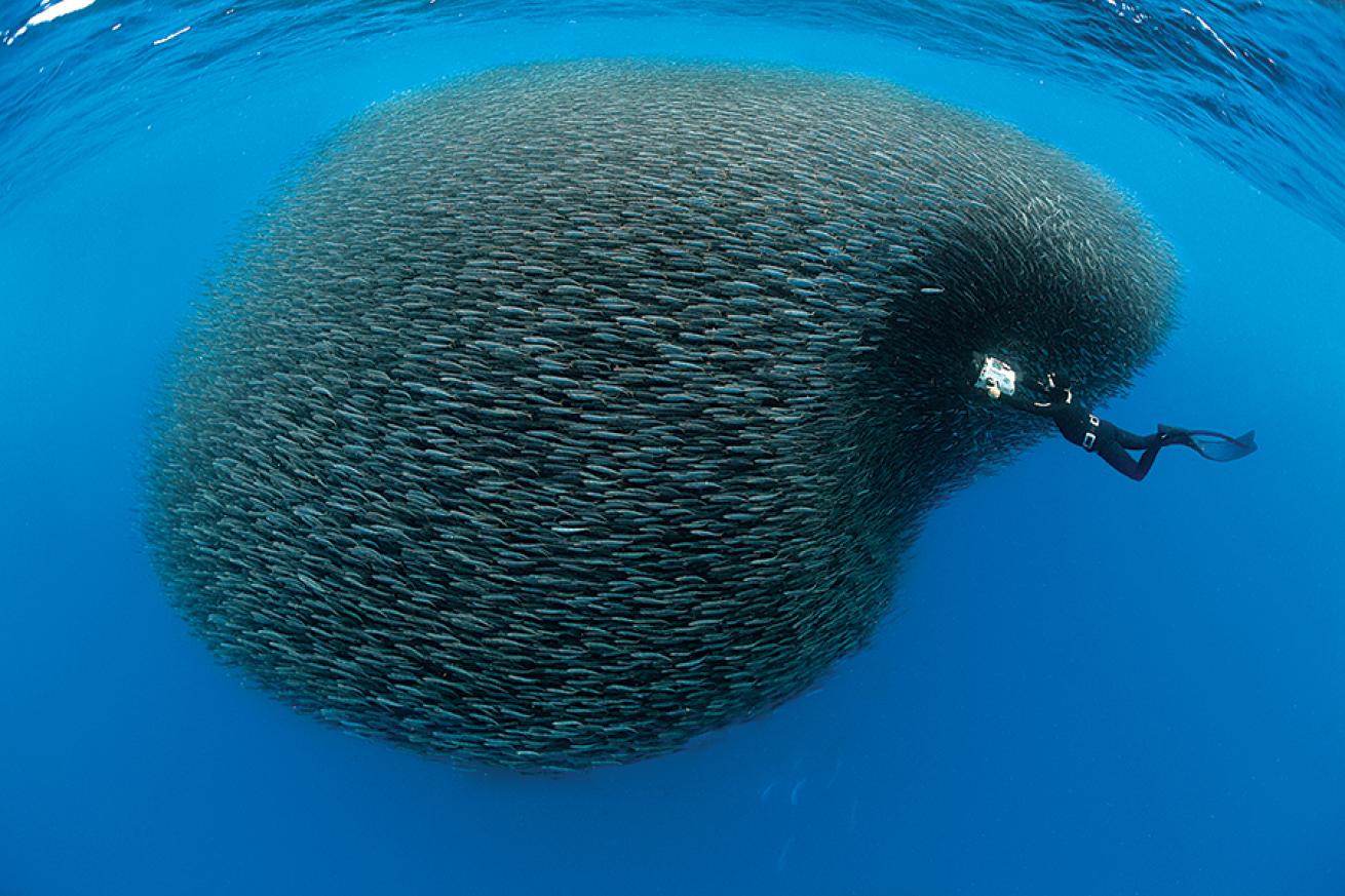 "This baitball spun and spun, constantly changing shape. Dolphins, shearwaters and seagulls attacked it as it spun. When the scene was quiet, I captured this moment."