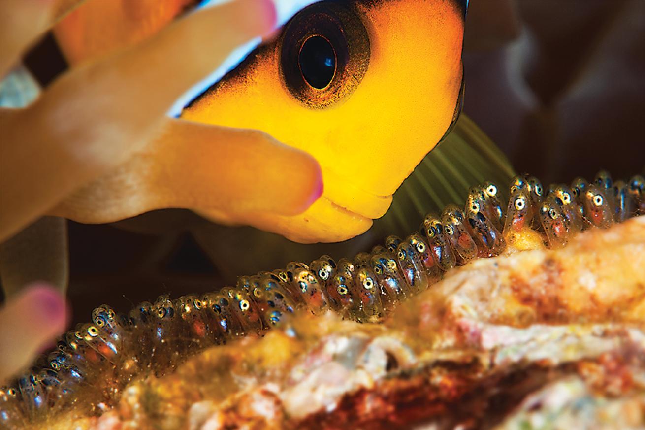 "While diving with my wife on vacation, she pointed out this scene: a clownfish in an anemone, caring for its eggs."