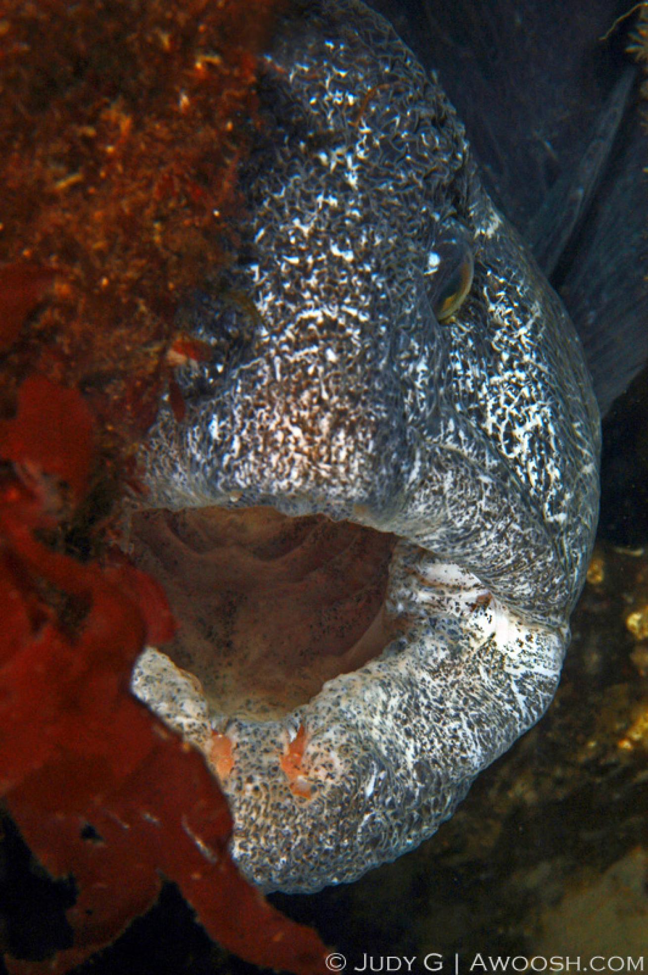 This fish is so ugly that it is cute. Wolf Eels are a favorite critter for cold water divers. They live in dens on the reef, often in mated pairs, and like many other eels are quite shy and tend to retreat into their lairs on approach.