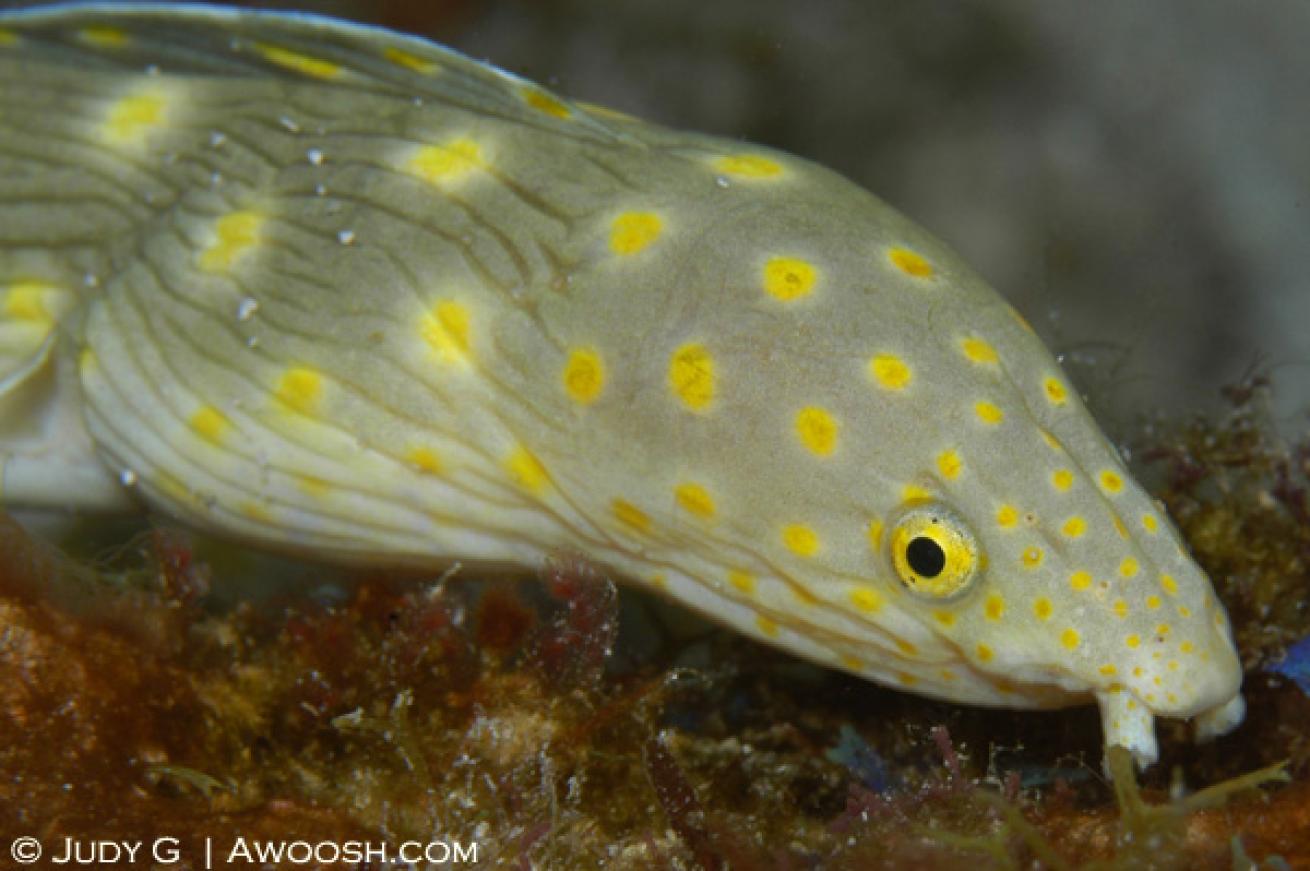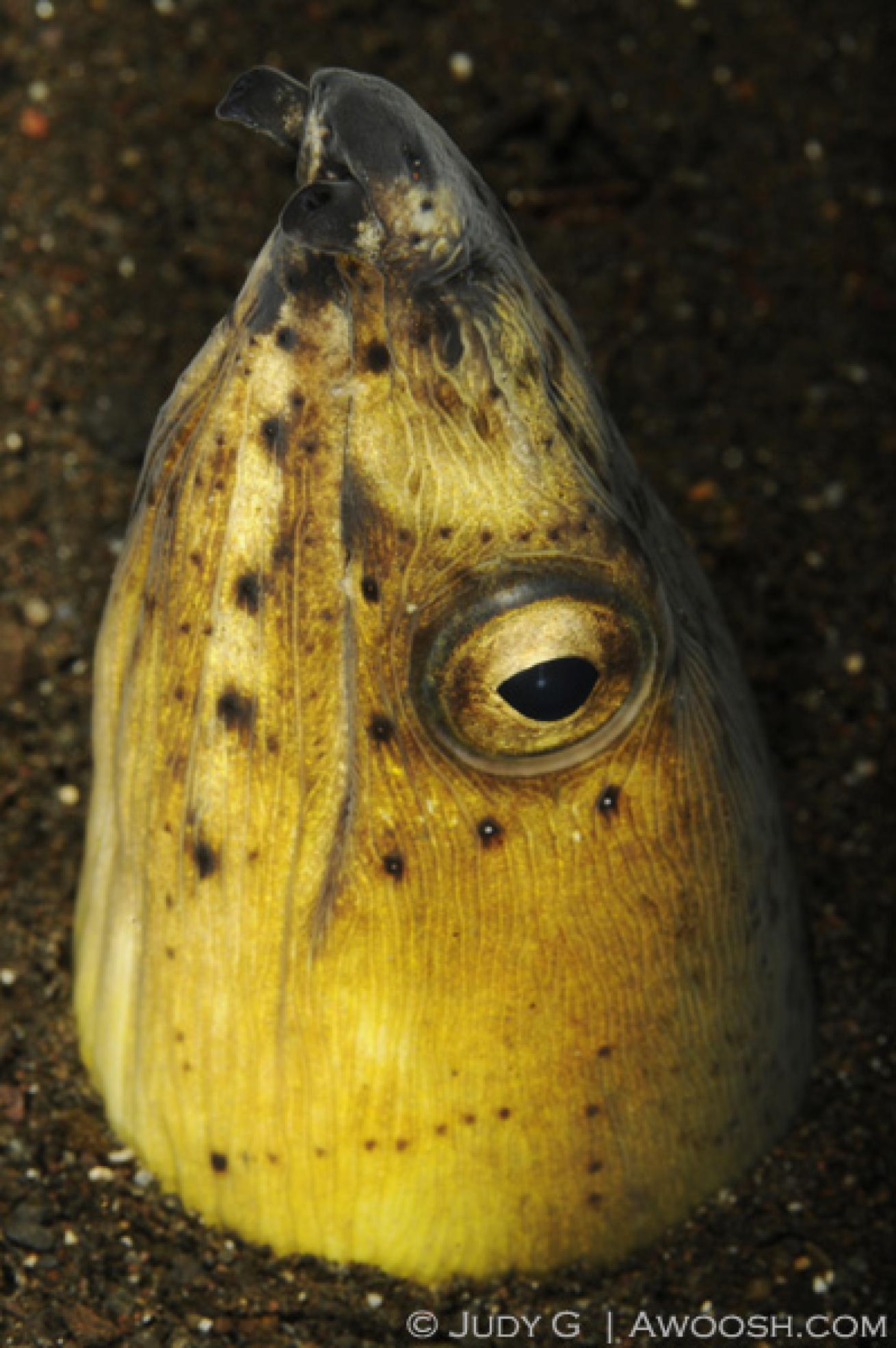 These beautiful eels are difficult photography subjects, as they tend to recede into their dens on a diver’s approach, and it can be a long wait before they come out again. Juveniles are black with a fine yellow dorsal fin, and females are all yellow. This is a mature male.
