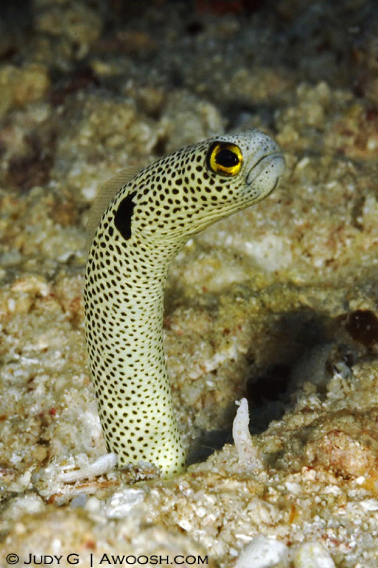 As its name suggests, garden eels tend to live in communities, and they are found in many locations. These are another bottom dwelling eel that lives in burrows. They wave in the current like sea grass as they snatch little flyby snacks. They will quickly recede back into their holes when divers or predators approach, and so they can be very difficult to photograph.