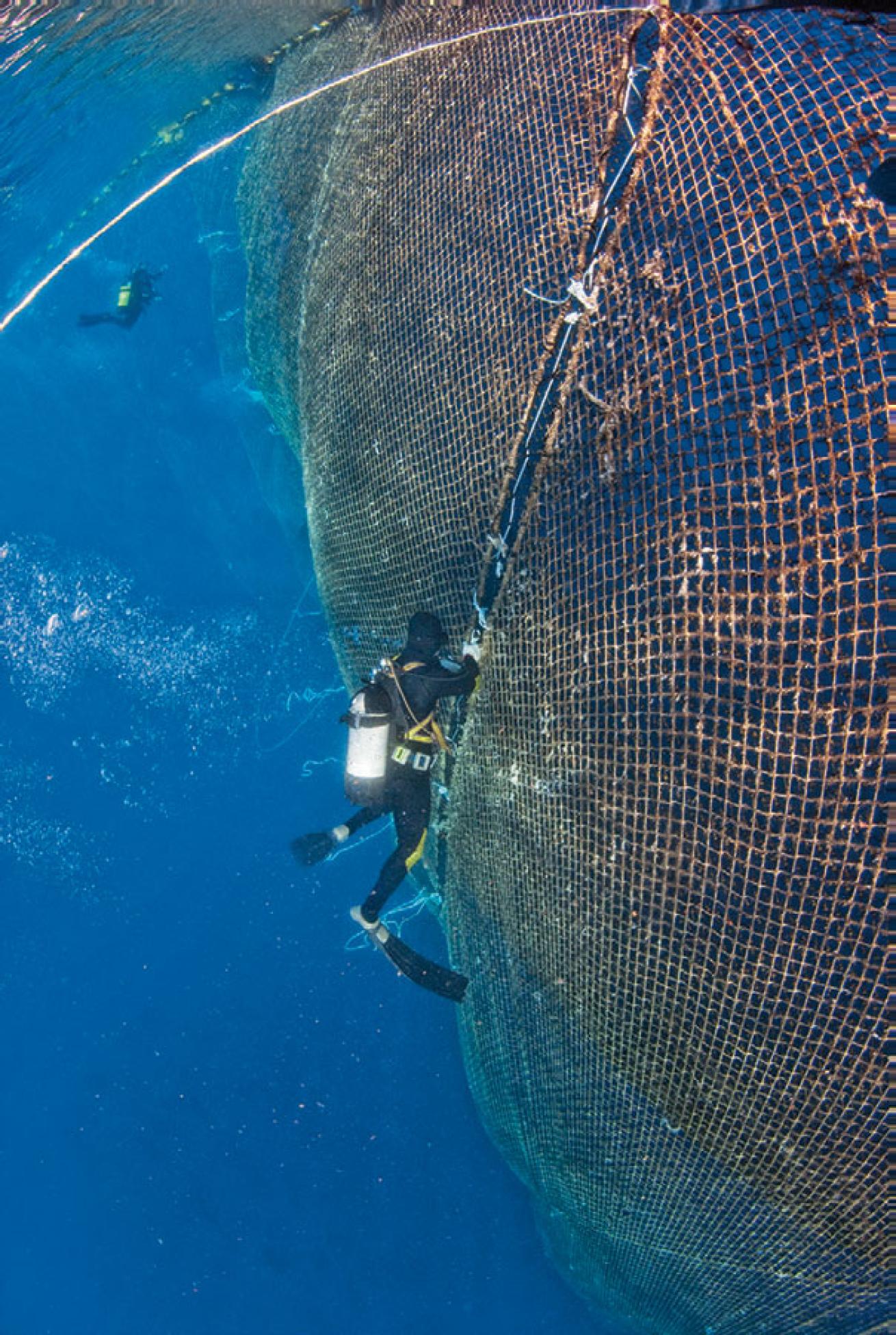 Antonio BusielloA diver opens a passage between fishing and farm nets.