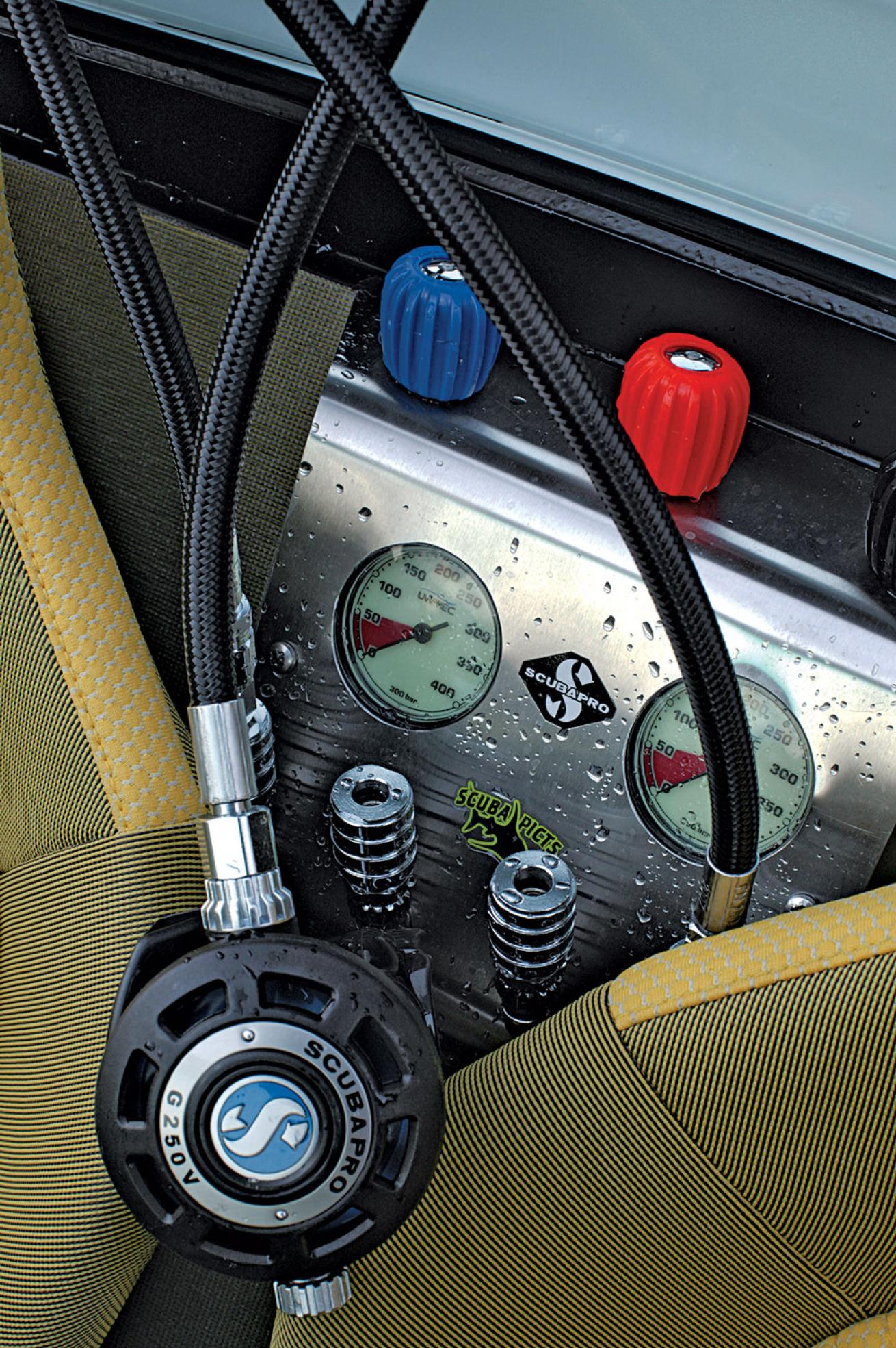 Courtesy Rinspeed.comRinspeed’s sQuba car comes standard with two Scubapro regs, and integrated-air tanks for driver and passenger. To submerge sQuba, the driver must simply pull a lever.