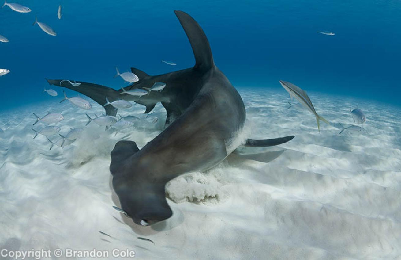 Brandon ColeGreat hammerhead sharks use sensory organs on the underside of their head to find prey.