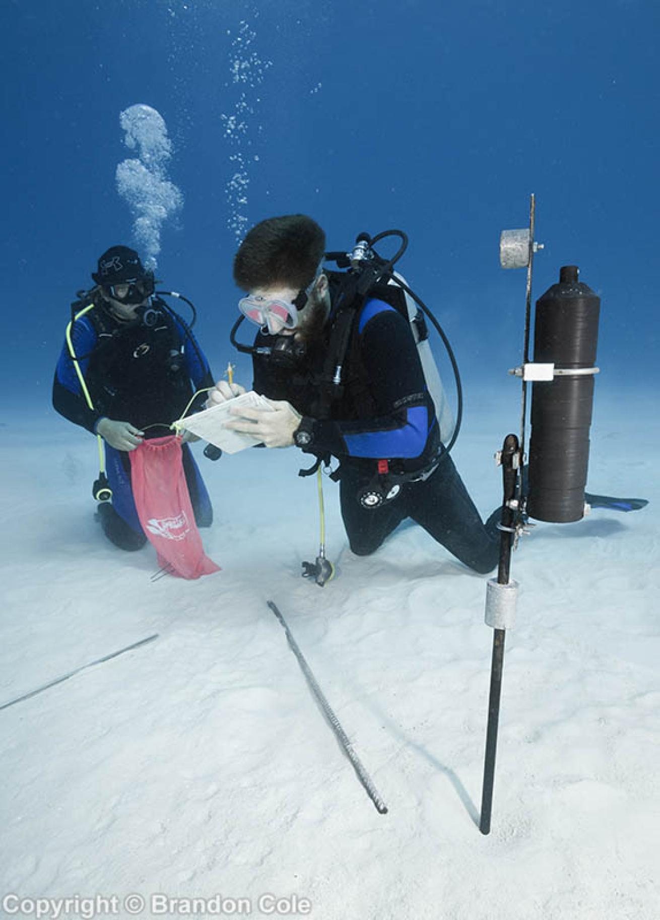 Brandon ColeScientists from Bimini's Sharklab study hammerhead sharks using acoustic receivers underwater.