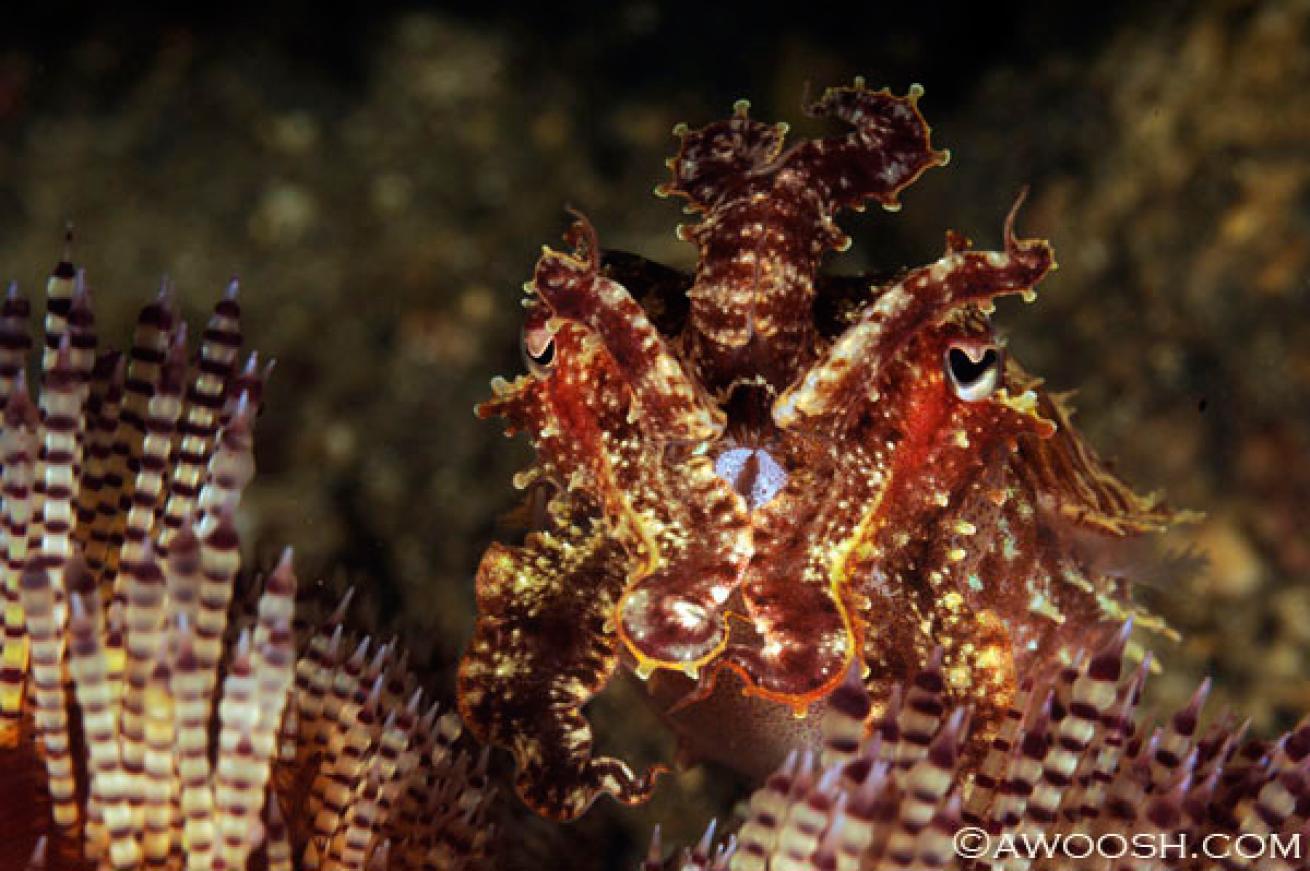 These little crinoid cuttlefish (Sepia Sp 2) are great at blending in with their environment, which keeps them safe from predators, and also allows them to ambush their prey. This little member of the cephalopod family grows to about an inch-and-a-half long. It is hovering over a very colorful (and toxic!) fire urchin (Asthenosoma varium).