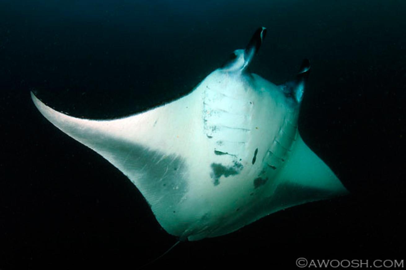 It is always a thrill to see a majestic manta ray winging by. In Komodo, there are several locations where schooling mantas can regularly be seen. This image of a giant manta (Manta birostris) was taken in a murky current pass in the south islands of the park. It was just one of a squadron that thrilled us on a couple of early-morning dives we did there.