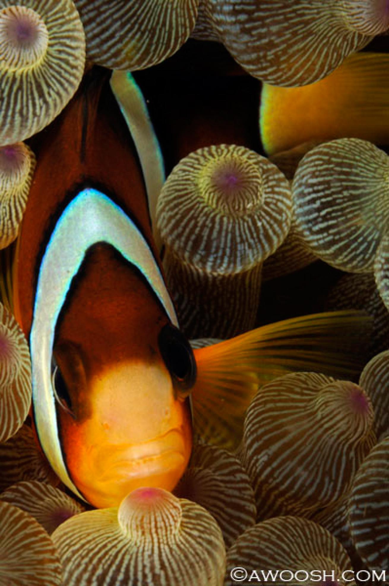 The reefs of Komodo are lively and colorful. There are many varieties of the ever-entertaining anemonefish to be seen, including these Clark’s anemonefish (Amphiprion clarkii) – this one living in a bubble-tip anemone (Entacmaea quadricolor).