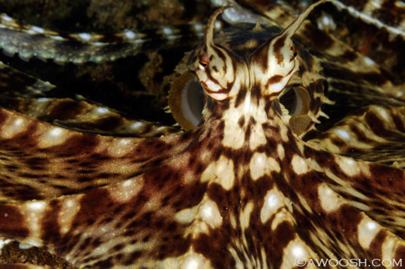 The fascinating mimic octopus (Thaumoctopus mimicus) not only can change its colors (like its other octopus cousins), but it can actually mimic other species of animals. I’ve seen one all flattened out and light-colored, scooting across the sand, looking very much like a sole. They have been documented to take the form and coloration of several other sea creatures as well. These weird and wonderful octopi typically live in silt-bottomed shallow bays.