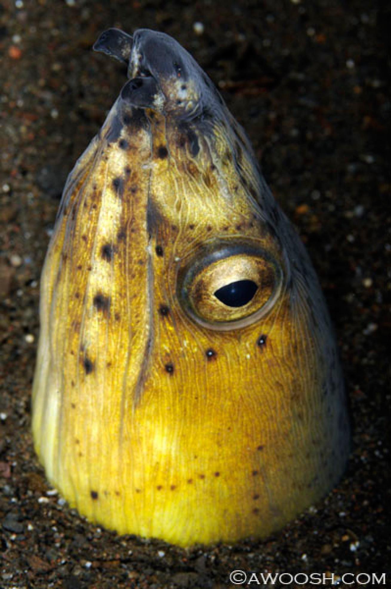 This is the usual view of one of these weird snake eels. They burrow their long bodies down vertically into the silt, so all you will see is their heads poking up out of the muck like this. They are ambush predators, and as such remain very still, mimicking a bit of wood or other detritus, waiting for their prey to come by before they strike. I had quite a scare during a night dive when another snake eel, out of its lair and startled by my dive light, bolted straight at me from out of the dark. It was the first one I had seen out like that — I had no idea that they were up to 3 feet long.