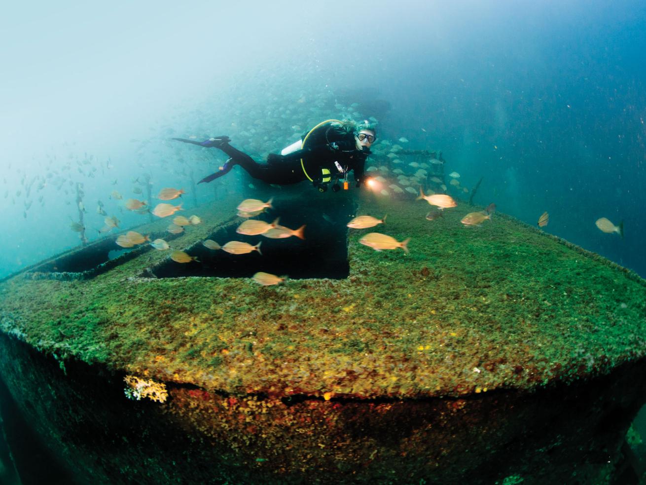 Let’s start with the biggest: the 888-foot USS Oriskany. Diving the world’s largest artificial reef is all my buddy and I talk about on the drive from Orlando to Pensacola, Florida. So we’re a bit disappointed when we learn our frst dive will be on the rubbly remains of the 315-foot San Pablo.