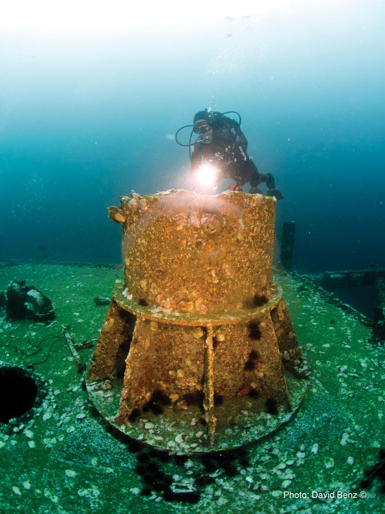 We’ve come to explore four of the 12 wrecks on the Florida Panhandle Shipwreck Trail: San Pablo, the former fleet tug Accokeek, the Twin Tugs and the Oriskany. The state of Florida’s Bureau of Archaeological Research created the trail; working with local dive operators, the bureau chose the wrecks for the overall quality of their diving, ease of accessibility and historic signifcance. Price says that if you know what you’re looking at, the San Pablo is a fascinating dive. “You get to see the history — the refrigeration coils from when it was a banana boat. You also see the carnage from when it was destroyed.” Chris Hicks, one of the divemasters with H2O Below, chimes in: “It has more marine life than many of the other wrecks — the variety of life on San Pablo is a constant, no matter when you dive it.”