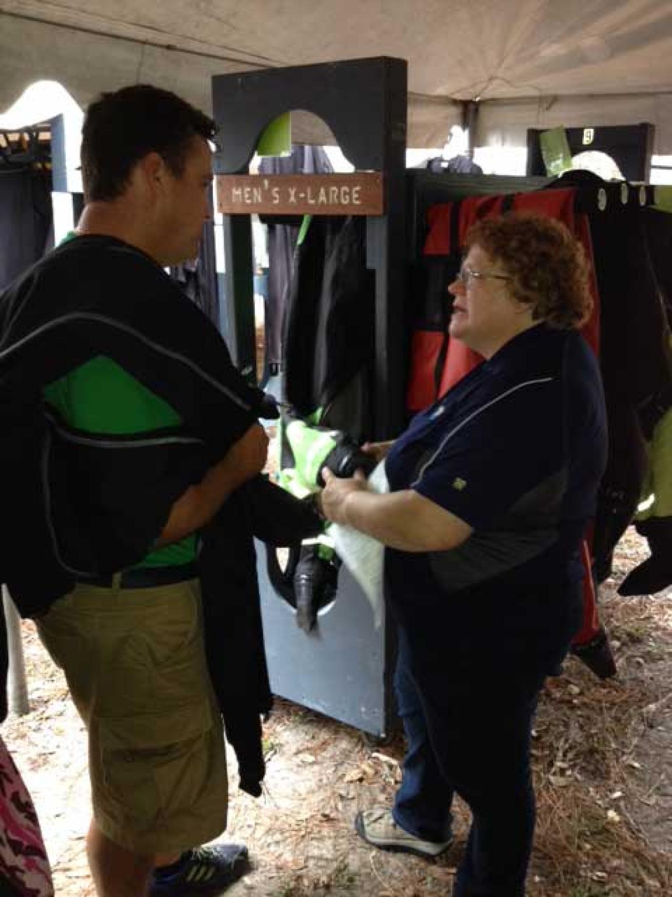 A diver chooses a new drysuit to try out and chats with one of the DUI volunteers. The volunteers sized and fit divers for seals and suits, installed inflator hoses on regs, helped divers suit up and get properly weighted, briefed them at the water’s edge, dived with each group and answered any questions.