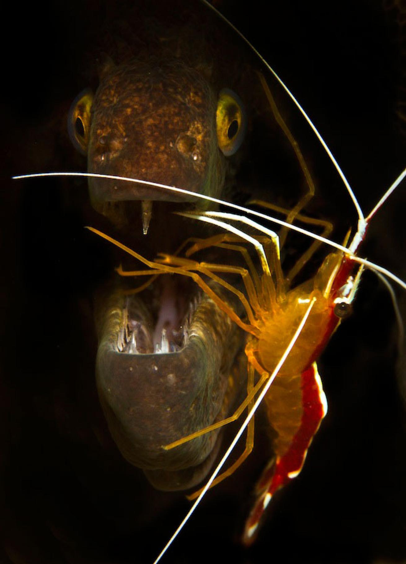 Aaron GekoskiA spindly shrimp plucking out tasty morsels from the razor-sharp teeth of a moray eel. I often wonder why the moray doesn't just eat the shrimp? Surely a tasty crustacean is better than grubby teeth? It would appear not.