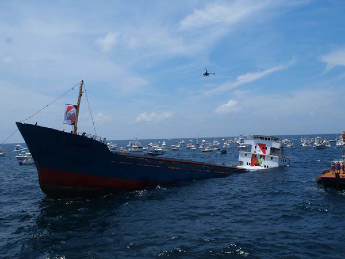 David BenzSurrounded by nearly 200 boats and the Wet Willie Band playing, Alabama’s first whole-ship diving reef, the 271-foot retired coastal freighter LuLu, was sunk exactly as planned.
