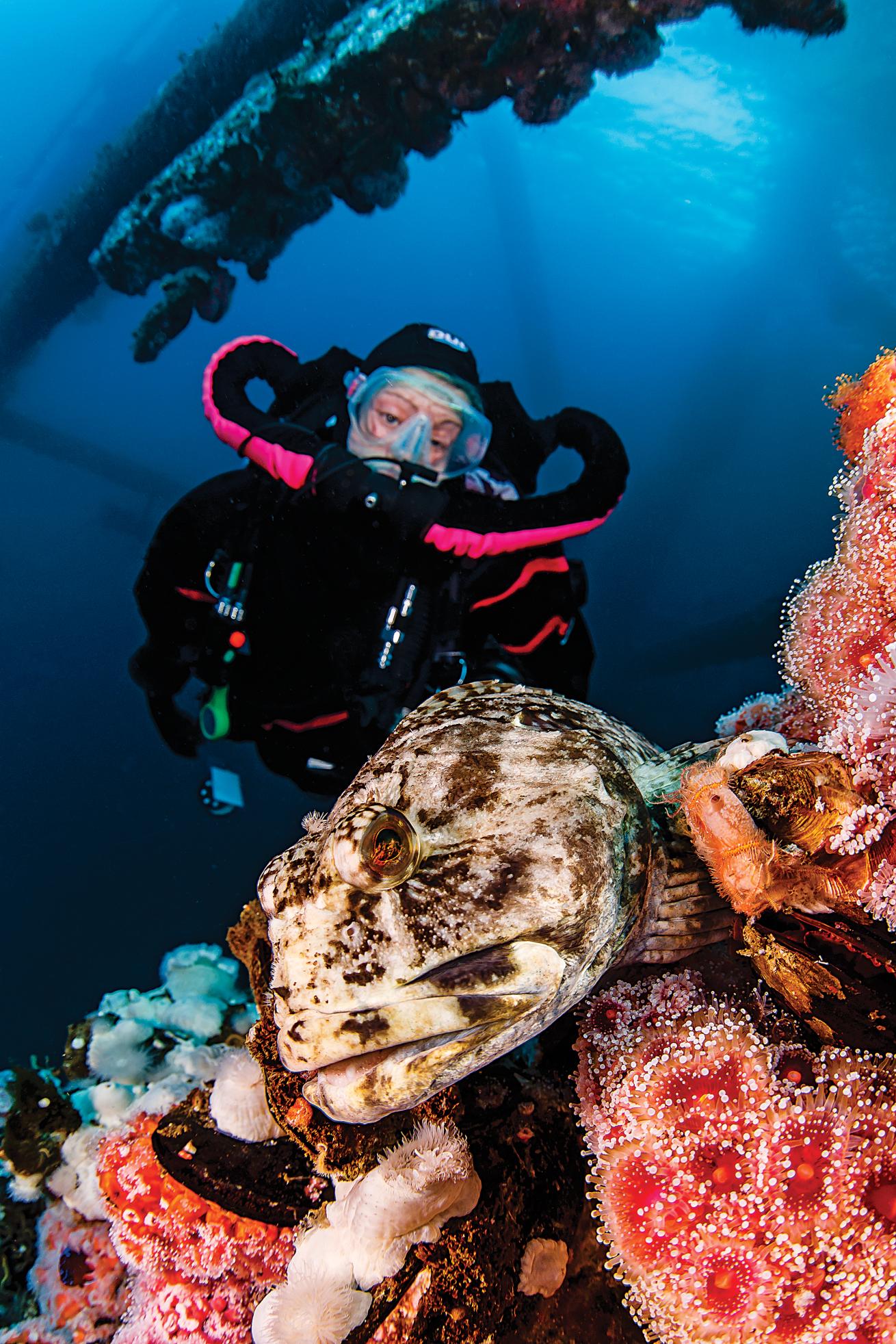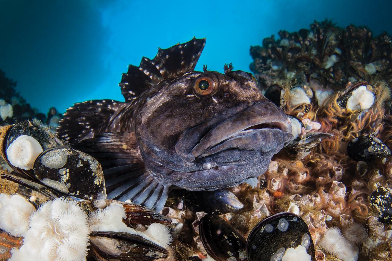 Below 100 feet, clusters of giant metridium anemones jut from girders encrusted with brittle stars, scallops and pink corynactis, giving the otherwise burly structure a fluffy pink-and-white coat. The search is a ritual for us, beginning anew at the start of nearly every platform dive. The process takes time, requiring a slow perusal of the structure that results in the discovery of other subjects. A large lingcod pouts from a nearby girder, but he refuses to sit still for a portrait and bolts into deep water. Then I come across an incredible find: a large male cabezon guarding a multihued egg nest.