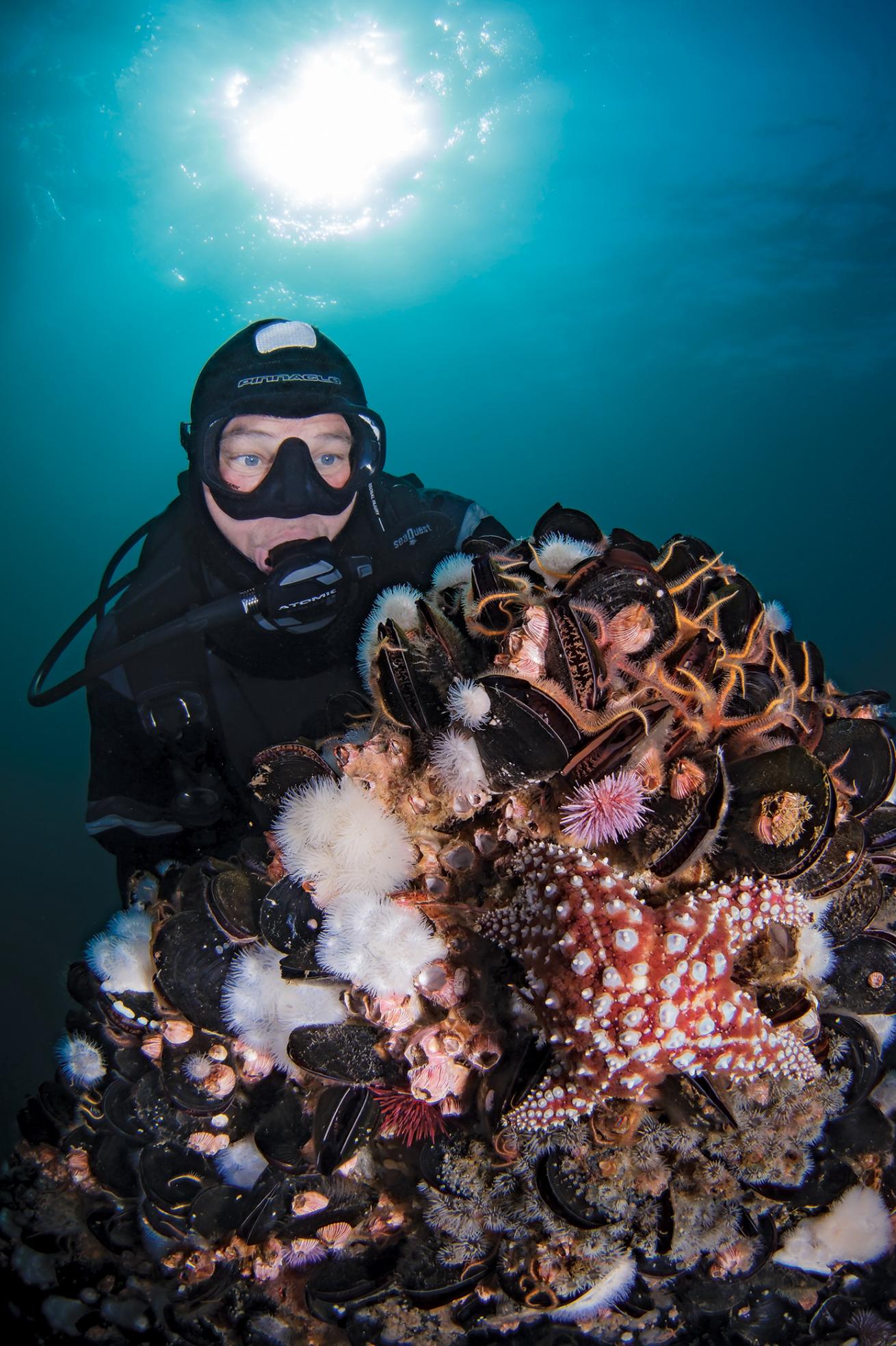 Mussels, starfish barnacles and anemones proliferate in the shallowest levels of the oil rig waters.
